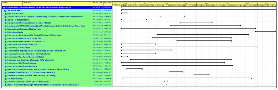 · Condition survey for the Structures · Foundation Works for Phase 1 of Methadone Clinic (MC) · Preliminary Works for Yau Ma Tei Assess Shaft (YMTAS) (hoarding, demolition, monitoring instrumentation) · Tree felling and transplanting for YMTAS · Predrilling Works for temporary Public Library cum Jade Hawker Bazaar Building (TPLBJHB) · Predrilling Works for temporary Maternal and Child Health Centre (TMCHC) · Connection of 300 dia Stormwater Drain & Construct 300 UC Channel for New Access Road to Fruit Market · Setting up and mobilization for diaphragm wall · Predrilling works at Zone A |