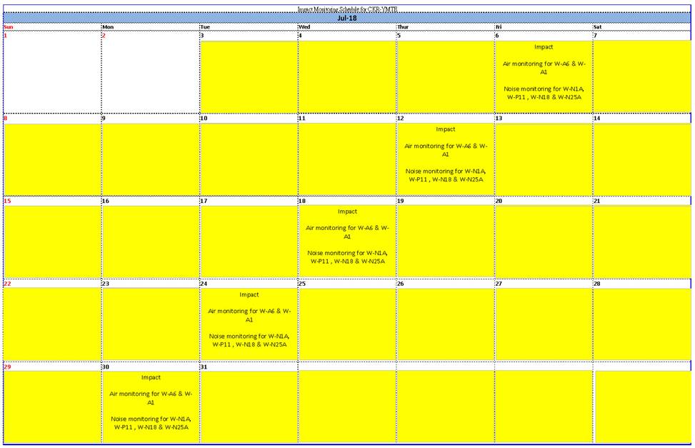 A.7 Joint weekly site inspections were conducted by representatives of the Contractor, Engineer and Contractor’s ET on 12 and 26 April 2018. The representative of IEC joined the site inspection on 12 April 2018 to review the site preparation works before the construction commencement day. Details of the audit findings and implementation status are presented in Section 6.
