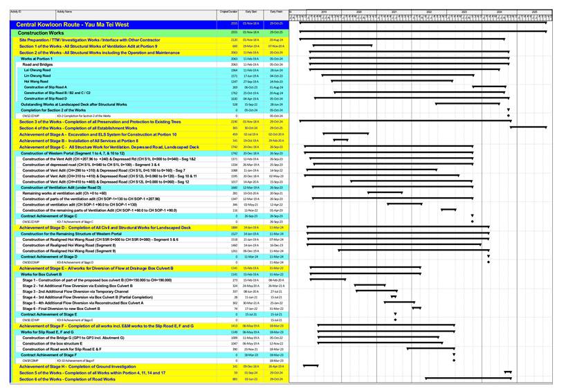 · Pre-drilling Works at Portion 1B, 1D, 1E and 1F · Socket H-pile at Portion 1B, 1D, 1E, 1F and 1G · Removal of existing Steel Bridge at Portion 1B, 1E and 1G · Reinforced Concrete(RC) works for Vent Adit at Ch 0-60 & Temporary Bulkhead Wall at Portion 9 · ELS and Excavation Works (Segment 4, 7, 10 to 12) for Vent Adit and Depressed Road Construction at Portion 1F and 10 · Guide Wall and D-Wall breaking works and Capping Beam Construction at Portion 1F · Jacking Pit/ Receiving Pit Construction of Sewerage System at Portion 1B · Pipe Jacking for DN 1650 sewer at Portion 1B and 17 · GRP Pipe Installation for New Sewerage at Portion 17, 1B and 1G · Vent Adit Ch 130~175 at Portion 1B · Bridge Deck Construction at Bridge B2/C2 (C2P1, C2P2 and B2P1) at Portion 1E · Pile Cap for B2P3 (Bridge B2) at Portion 1G · Pile Cap and Pier for CP1 (Bridge C) at Portion 1E · Temporary Lin Cheung Road (2nd Diversion) at Portion 1E · ELS and Excavation prior to Box Culvert B Construction and Vent Adit Ch250-280 at Portion 1D · Construction of Box Culvert B (Zone 4A) at Portion 1D · Bridge Deck Construction at Bridge G at Portion 1B |