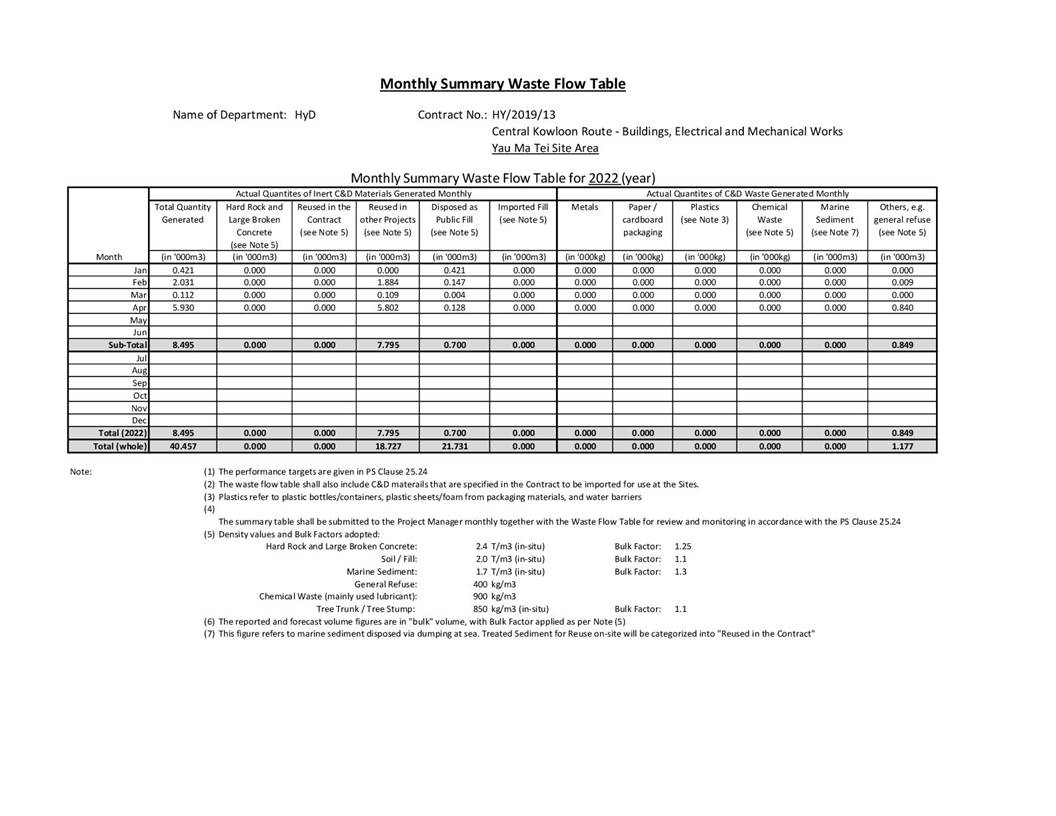 4.3 Site audits were carried out on a weekly basis to monitor and audit to ensure that proper storage, transportation and disposal practices of waste materials generated during construction activities, such as construction and demolition (C&D) materials and general refuse are being implemented. The summary of site audits are shown in Table 6.1 of this report. The implementation status of the waste/chemical management measures in the reporting period are summarized in Appendix C.