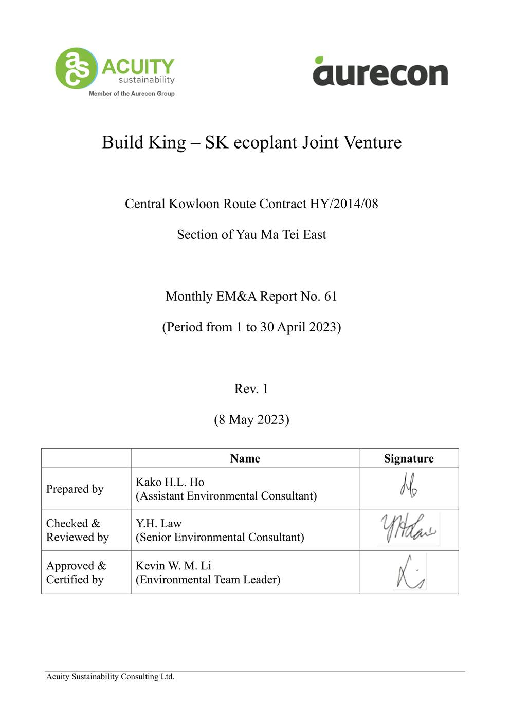 A.1 Build King – SK ecoplant Joint Venture (“Contractor”) commenced the construction works of Highway Department (HyD) Central Kowloon Route Contract No. HY/2014/08 – Section of Yau Ma Tei East (“The Project”) on 20 April 2018. This is the 61st monthly Environmental Monitoring and Audit (EM&A) report presenting the EM&A works carried out during the period from 1 April 2023 to 30 April 2023.