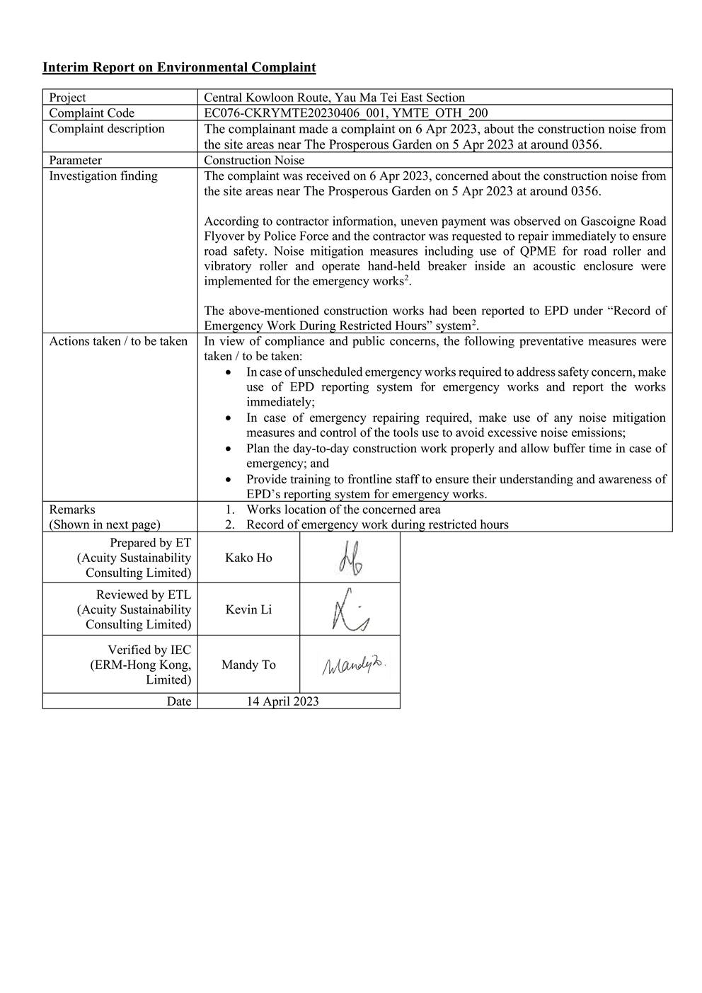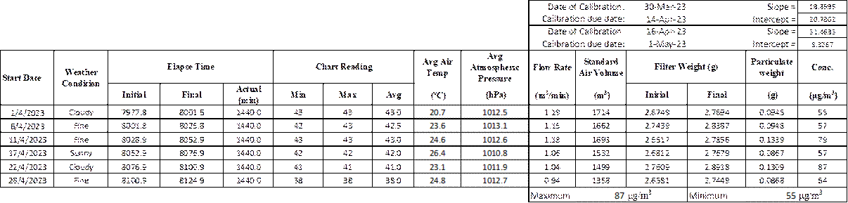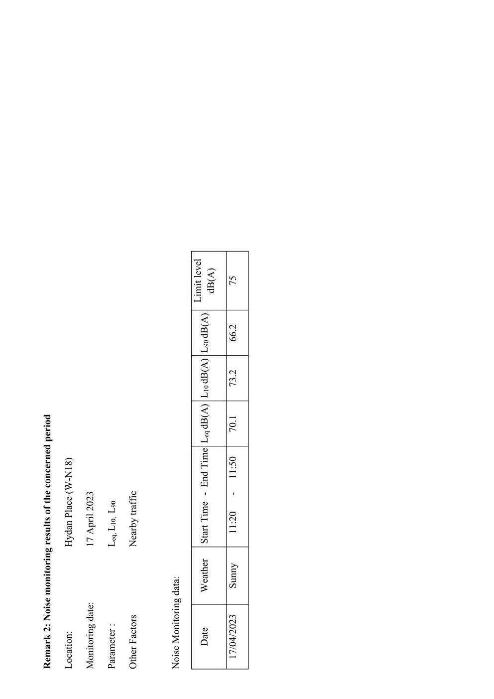 A.7 Three Action Levels of construction noise were triggered during the reporting month as documented complaints were received. No exceedance of Limit Level of construction noise was recorded in the reporting month. No exceedance of the Action and Limit Level of 24-hour TSP and 1-hour TSP was recorded in the reporting month.