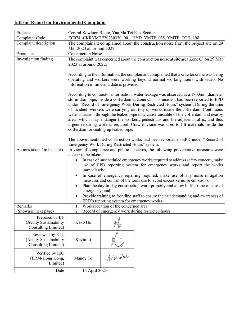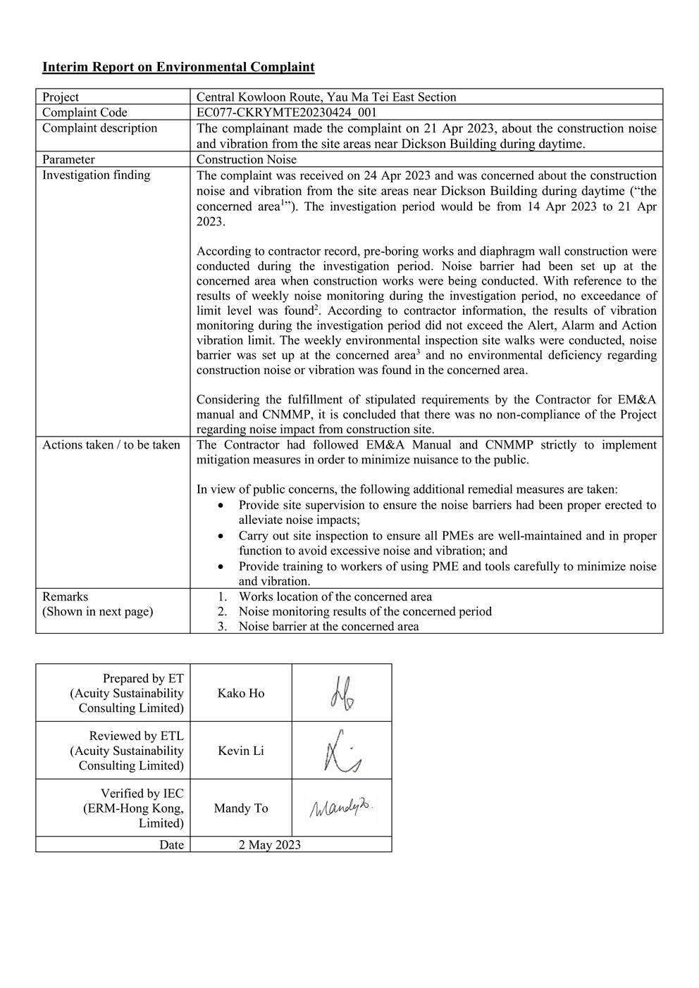 A.8 A total of three environmental complaints were received in the reporting month. After investigation with Contractor, precautionary measures had been proposed to the Contractor by ET. The interim reports for the complaints are shown in Appendix Q.
