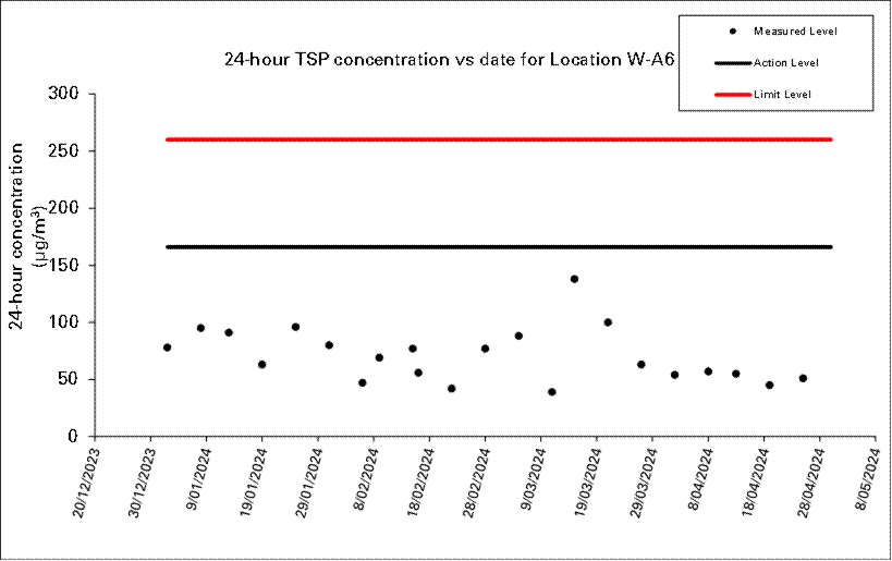 A.7 No exceedance of Action and Limit Level of construction noise, 24 hour TSP and 1 hour TSP was recorded in the reporting month.