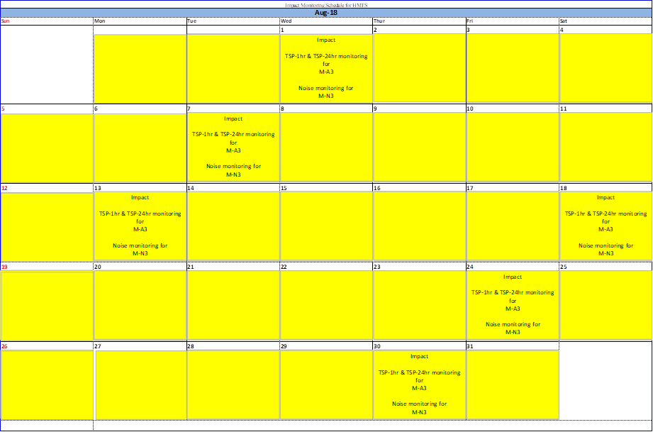 A.7 Joint weekly site inspections were conducted by representatives of the Contractor, Engineer and Contractor’s ET on 1,10,15,22 and 29 August 2018. The representative of IEC joined the site inspection on 10 August 2018. Details of the audit findings and implementation status are presented in Section 5.