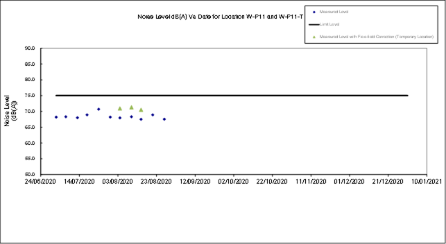 A.4 Noise monitoring station at the Coronation Tower 1 (W-P11) was temporarily suspended from 3 August 2020 to 16 August 2020due to a case of novel coronavirus infection at the Coronation Tower 6. Temporary alternative noise monitoring location, W-P11-T was used to conduct noise monitoring on 4, 10 and 15 August 2020. Details of temporary alternative monitoring location are presented in Temporary Alternative Proposal for Monitoring Station as proposed by ET and agreed by IEC dated 27 March 2020.