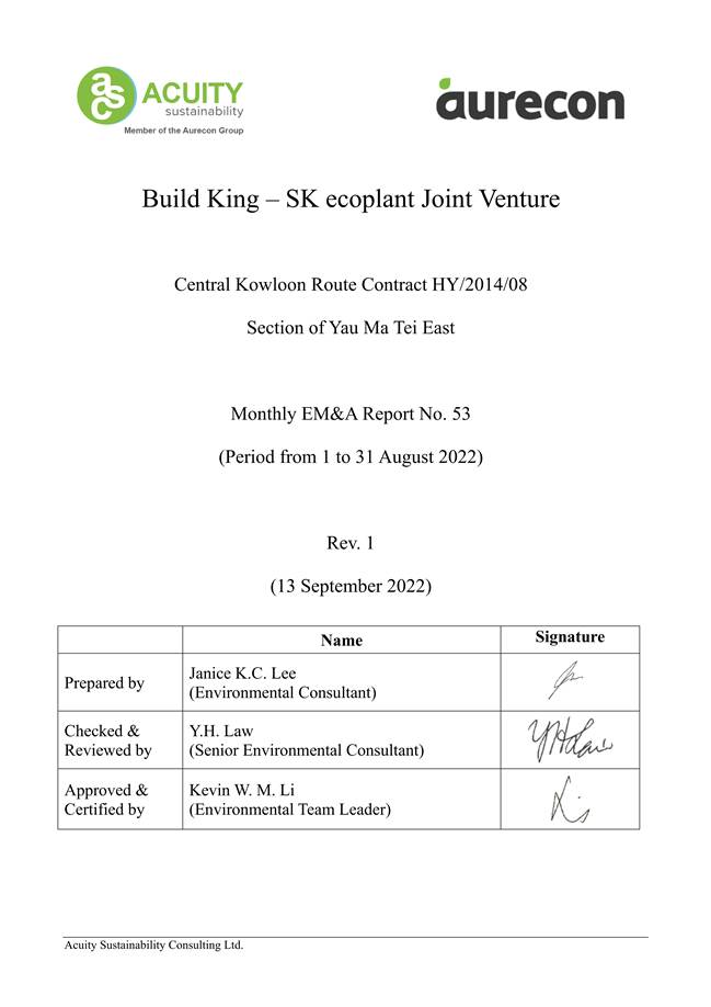 A.1            Build King – SK ecoplant Joint Venture (“Contractor”) commenced the construction works of Highway Department (HyD) Central Kowloon Route Contract No. HY/2014/08 – Section of Yau Ma Tei East (“The Project”) on 20 April 2018. This is the 53rd monthly Environmental Monitoring and Audit (EM&A) report presenting the EM&A works carried out during the period from 1 August 2022 to 31 August 2022.