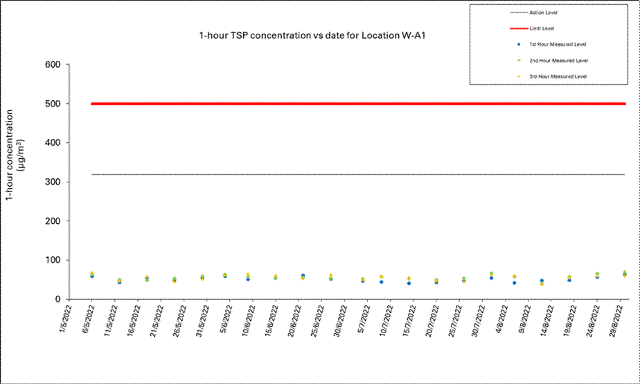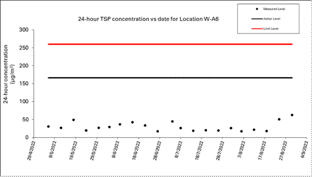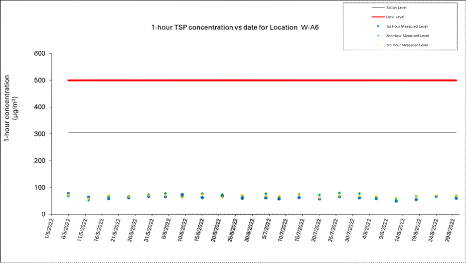 A.7            One Action Level of construction noise was triggered during the reporting period as a documented complaint was received on 12 August 2022 related to construction noise from works areas at Zone B2 and C. No exceedance of the Limit Level of construction noise was recorded in the reporting month. No exceedance of the Action and Limit Levels of 24-hour TSP and 1-hour TSP was recorded during the reporting month.