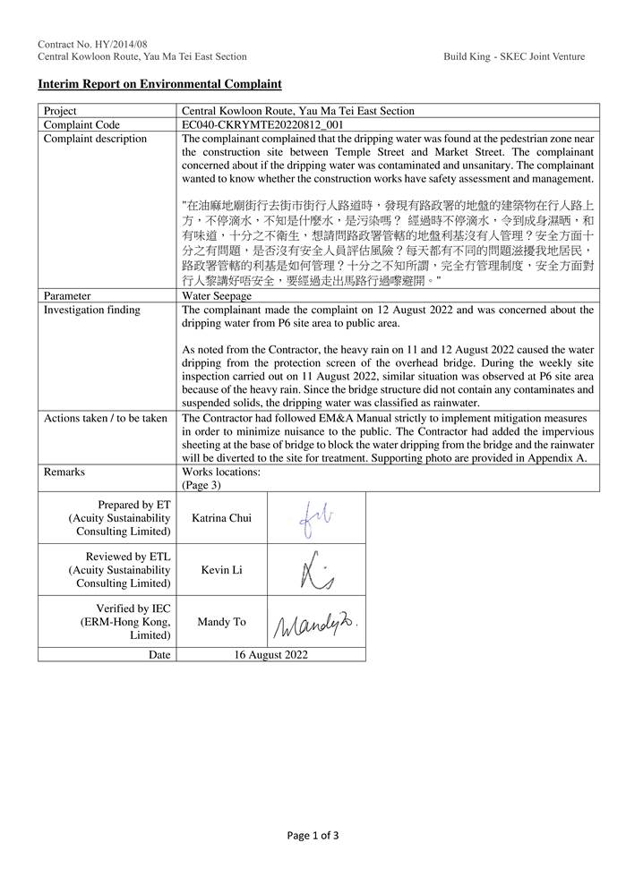 A.8            One dust related complaint was received on 4 August 2022, one water seepage related complaint, and one noise related complaint were received on 12 August 2022. After investigation with Contractor, precautionary measures had been proposed to the Contractor by ET. The interim report for the complaint is shown in Appendix Q.