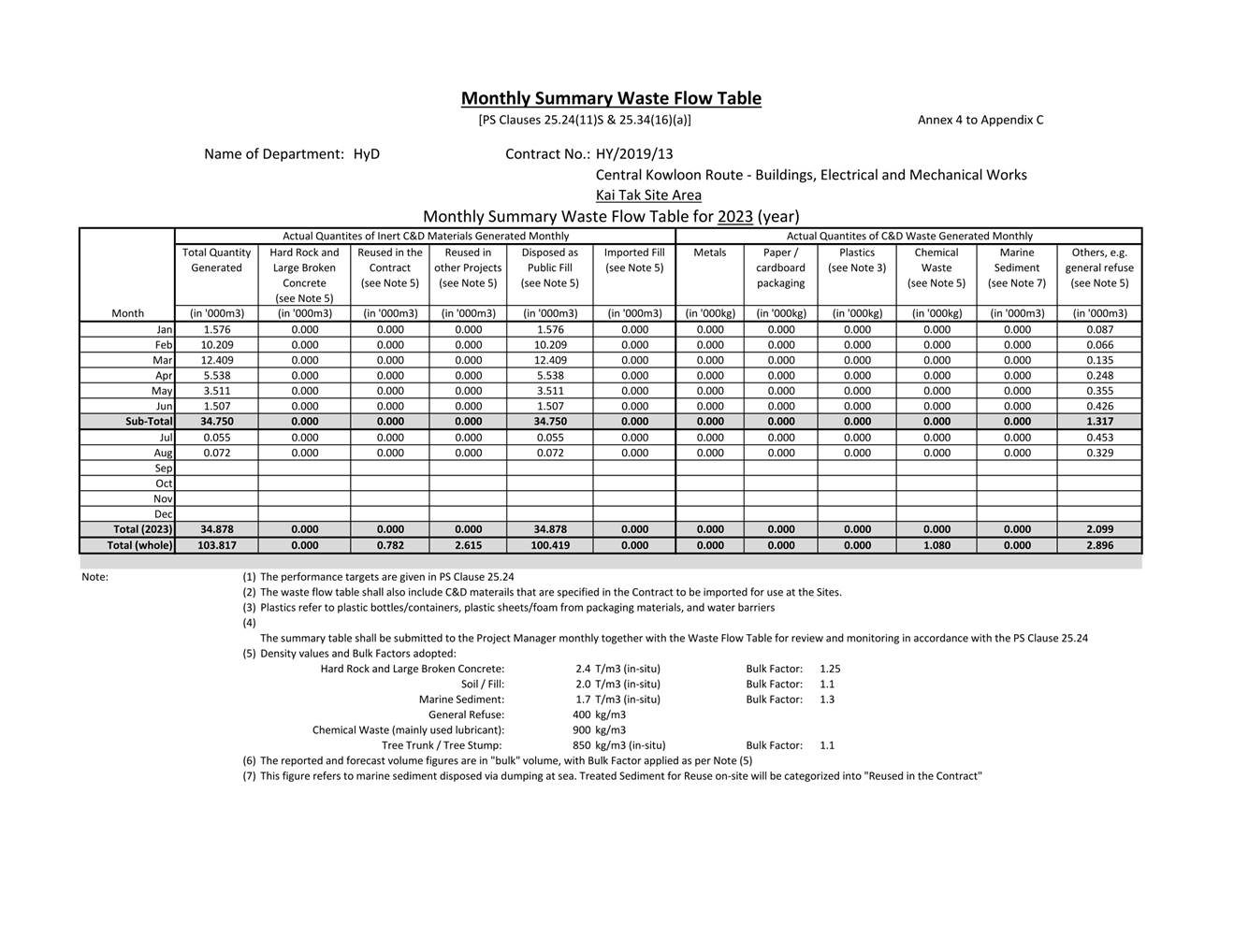 A.1 Alchmex – Paul Y Joint Venture (“Contractor”) commenced the construction works of Highway Department (HyD) Central Kowloon Route Contract No. HY/2018/02 – Section of Kai Tak East (“The Project”) on 9 September 2019. This report is the 48th monthly Environmental Monitoring and Audit (EM&A) report presenting the EM&A works carried out during the period from 1 August 2023 to 31 August 2023.