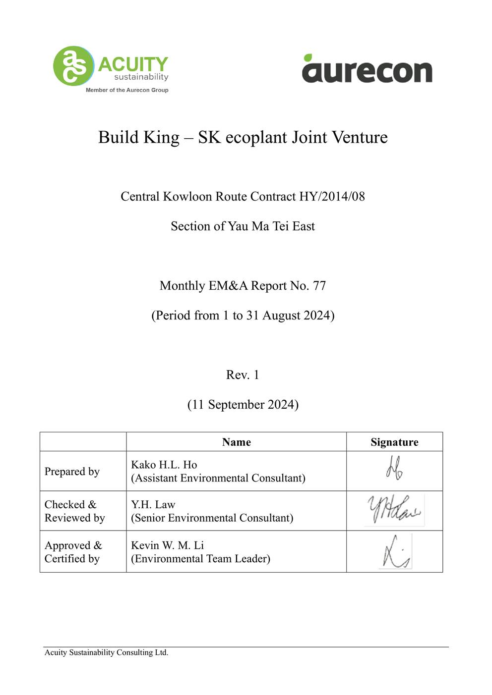 A.1 Build King – SK ecoplant Joint Venture (“Contractor”) commenced the construction works of Highway Department (HyD) Central Kowloon Route Contract No. HY/2014/08 – Section of Yau Ma Tei East (“The Project”) on 20 April 2018. This is the 77th monthly Environmental Monitoring and Audit (EM&A) report presenting the EM&A works carried out during the period from 1 August 2024 to 31 August 2024.