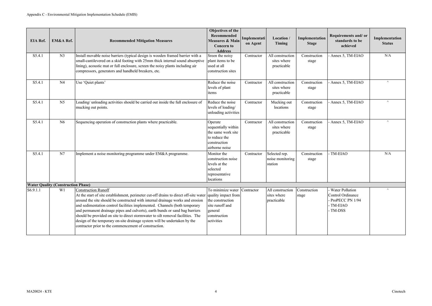 6.3        According to Environmental Permit, the approved EIA Report (Register No.: AEIAR-171/2013), and the EM&A Manual of the Project, the mitigation measures detailed in the documents are recommended to be implemented during the construction phase.  An Environmental Mitigation Implementation Schedule (EMIS) is provided in Appendix C.
