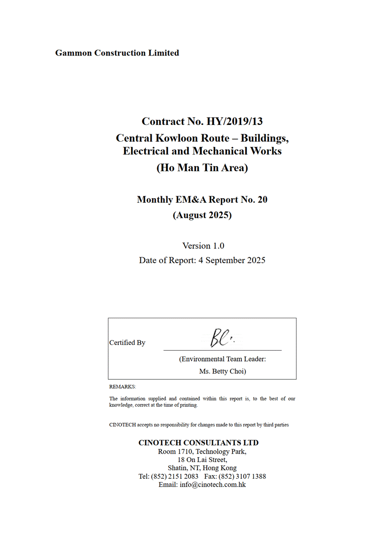 1. This is the 20th Monthly Environmental Monitoring and Audit (EM&A) Report prepared by the Environmental Team (ET), Cinotech Consultants Ltd., for Contract No. HY/2019/13 ¡§Central Kowloon Route ¡V Buildings, Electrical and Mechanical Works¡¨. This report summarises the monitoring results and audit findings of the EM&A programme under the issued EP No. EP-457/2013/D, and in accordance with the EM&A programme in the Ho Man Tin area during the reporting period from 1 August 2025 ¡V 31 August 2025.