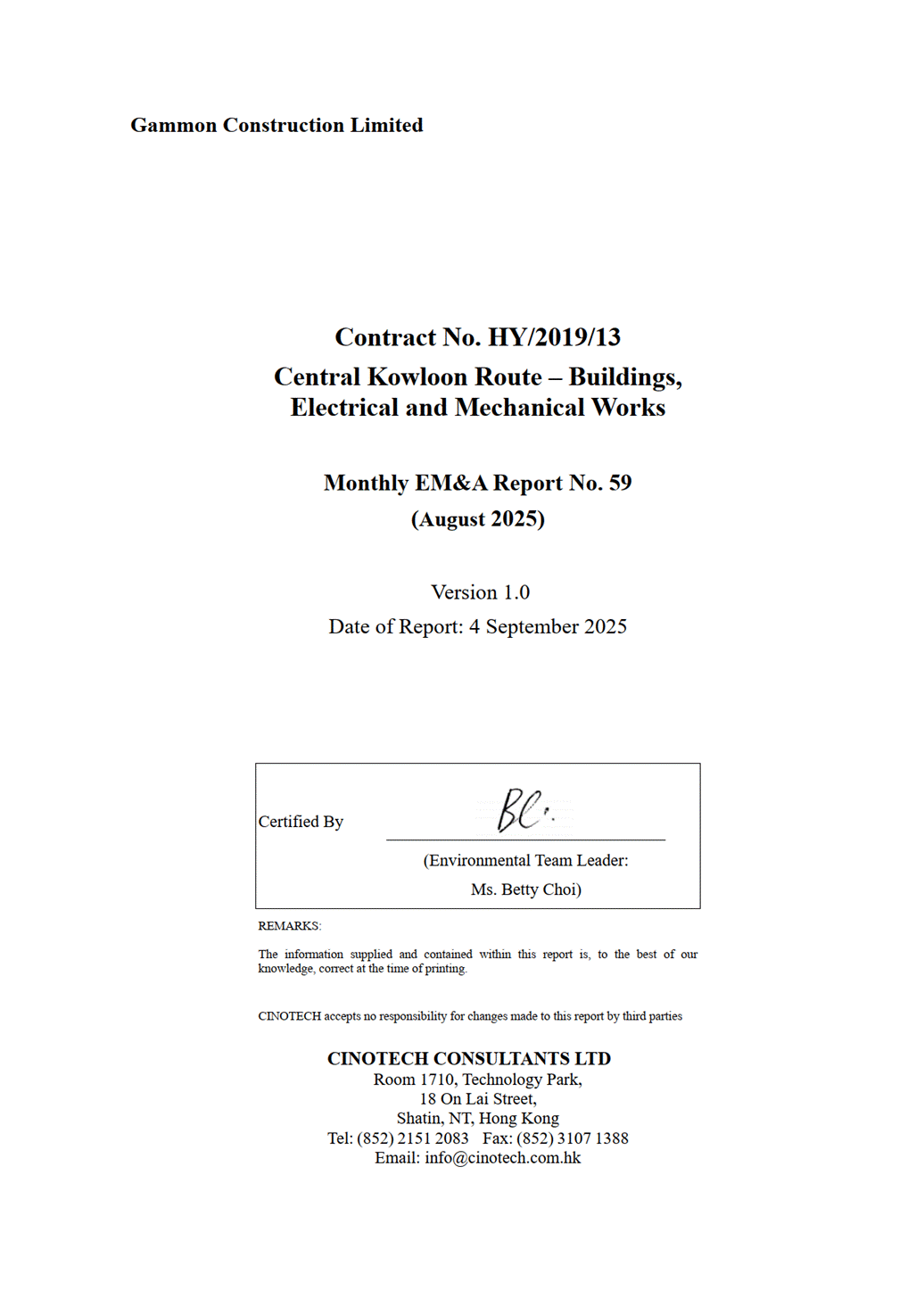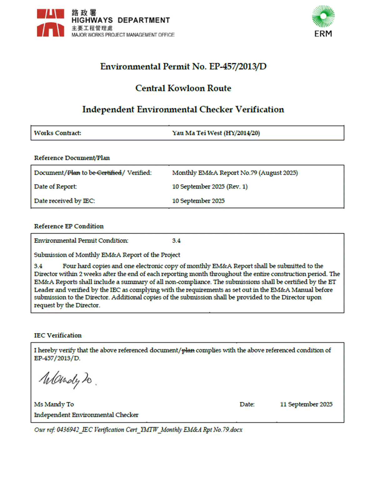A.1 Build King – SK ecoplant Joint Venture (“Contractor”) commenced the construction works of Highway Department (HyD) Central Kowloon Route Contract No. HY/2014/20 – Section of Yau Ma Tei West (“The Project”) on 12 February 2019. This is the 79th monthly Environmental Monitoring and Audit (EM&A) report presenting the EM&A works carried out during the period from 1 August 2025 to 31 August 2025.