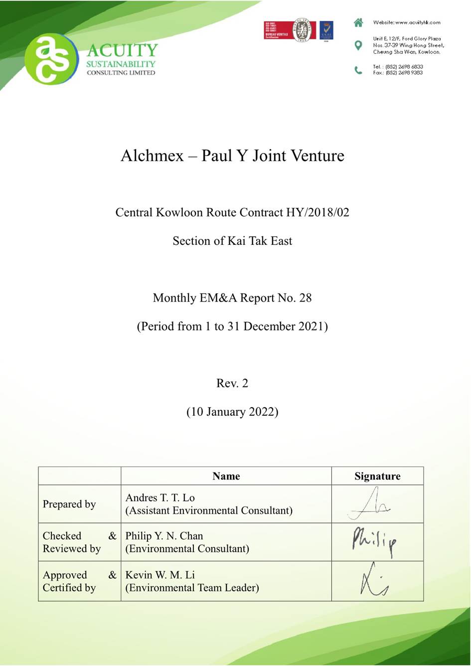 A.1 Alchmex – Paul Y Joint Venture (“Contractor”) commenced the construction works of Highway Department (HyD) Central Kowloon Route Contract No. HY/2018/02 – Section of Kai Tak East (“The Project”) on 9 September 2019. This is the 28th monthly Environmental Monitoring and Audit (EM&A) report presenting the EM&A works carried out during the period from 1 December 2021 to 31 December 2021.