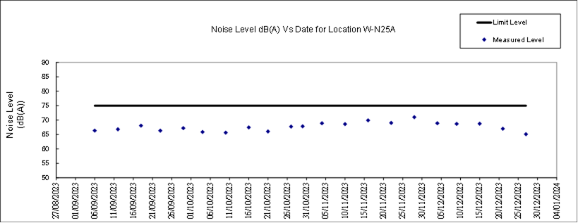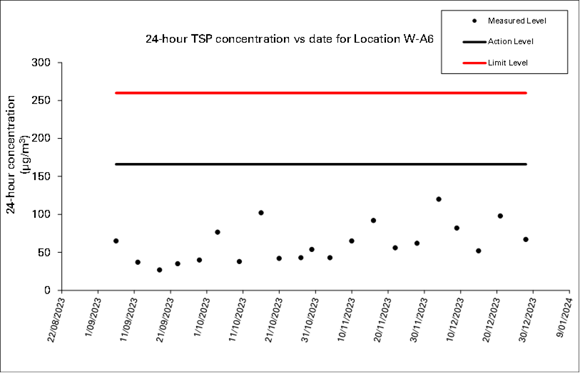 A.7 Three Action Levels of construction noise were triggered during the reporting month as documented complaints were received. No exceedance of Limit Level of construction noise was recorded in the reporting month. No exceedance of the Action and Limit Level of 24 hour TSP and 1 hour TSP was recorded in the reporting month.