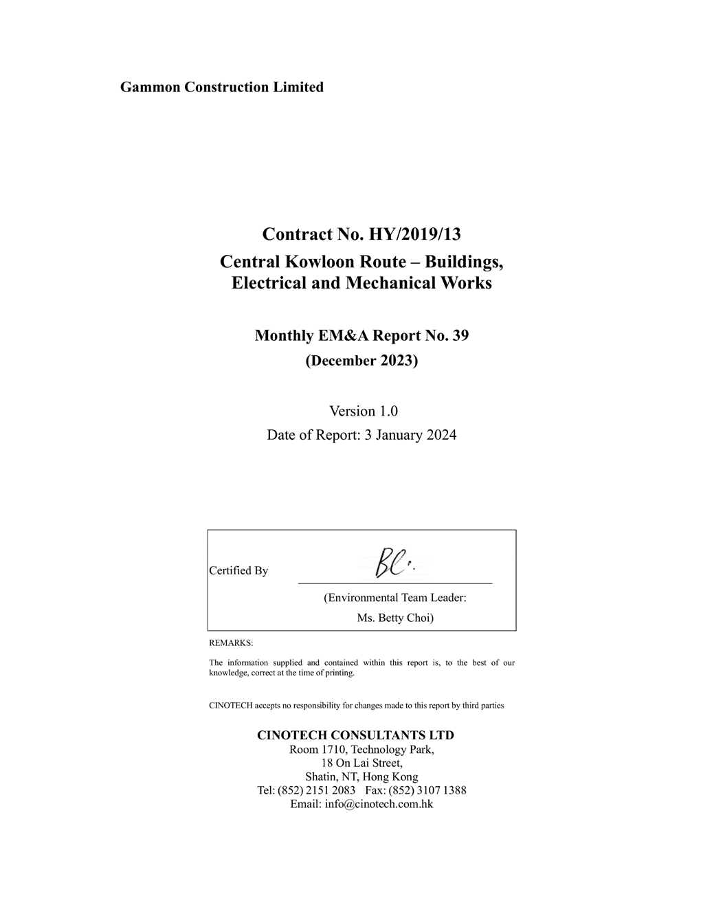 1. This is the 39th Monthly Environmental Monitoring and Audit (EM&A) Report prepared by the Environmental Team (ET), Cinotech Consultants Ltd., for Contract No. HY/2019/13 “Central Kowloon Route – Buildings, Electrical and Mechanical Works”. This report summarized the monitoring results and audit findings of the EM&A programme under the issued EP No. EP-457/2013/D, and in accordance with the EM&A programme in Yau Ma Tei West Area during the reporting period from 1st December 2023 – 31st December 2023.
