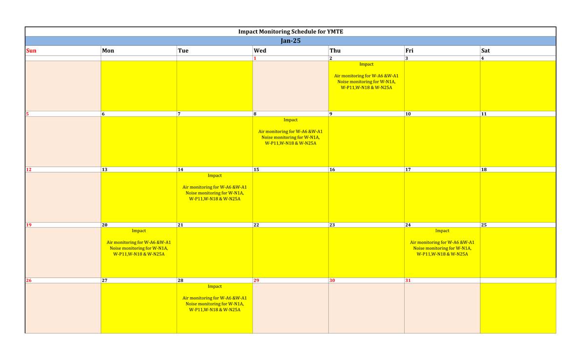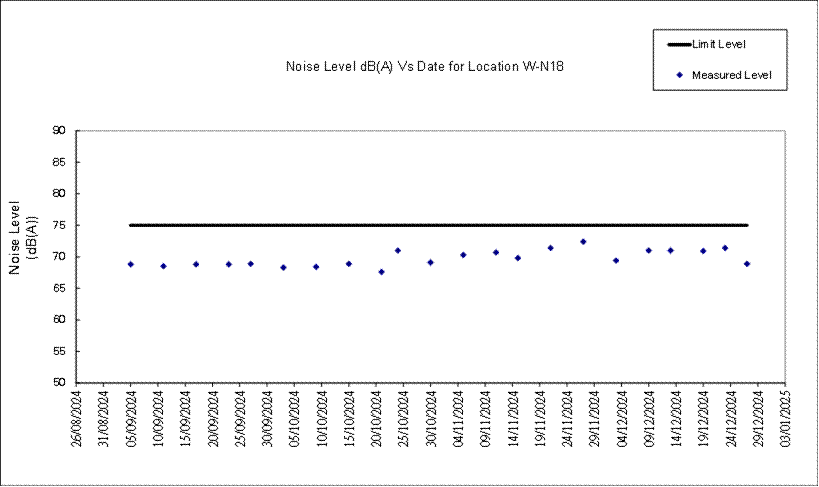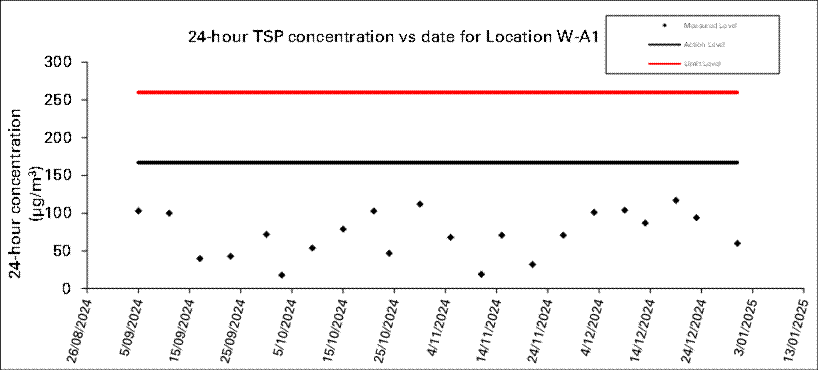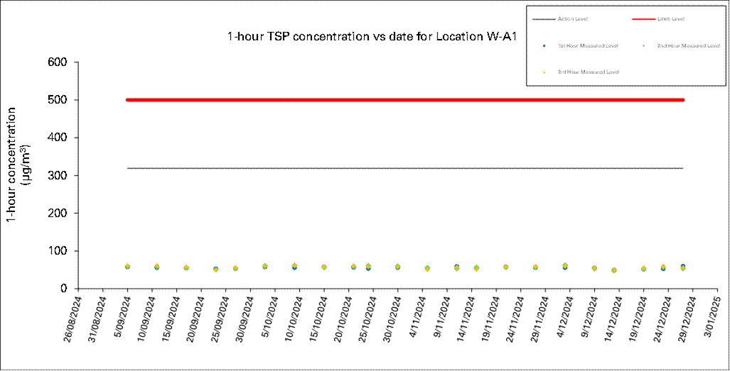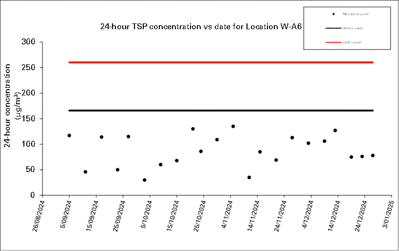 A.7 Five Action Level of construction noise were triggered during the reporting month as documented complaints were received. No exceedance of Limit Level of construction noise was recorded in the reporting month. No exceedance of the Action and Limit Level of 24-hour TSP and 1-hour TSP was recorded in the reporting month.