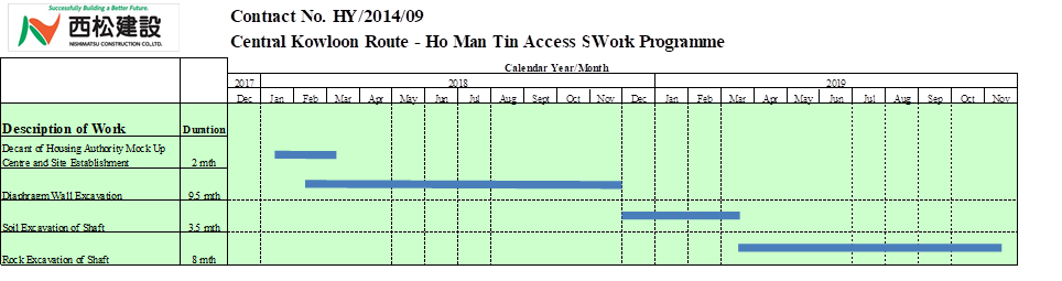 1.3. The construction of the CKR had been divided into different sections. This Contract No. HY/2014/09 - Ho Man Tin Access Shaft (HMTS) (“The Project”) covers part of the construction activities located at Ho Man Tin under the EP which includes: