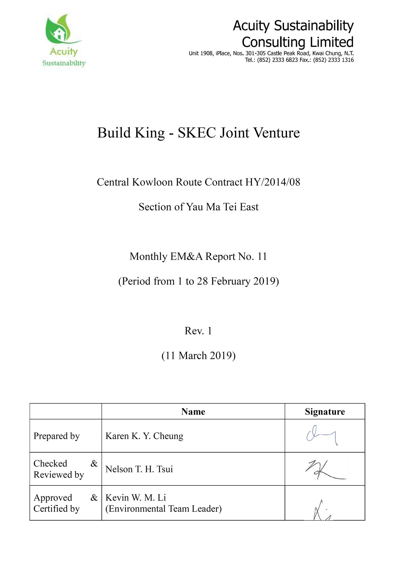 A.1 Build King – SKEC Joint Venture (“Contractor”) commenced the construction works of Highway Department (HyD) Central Kowloon Route Contract No. HY/2014/08 – Section of Yau Ma Tei East (“The Project”) on 20 April 2018. This is the 11th monthly Environmental Monitoring and Audit (EM&A) report presenting the EM&A works carried out during the period from 1 February 2019 to 28 February 2019.