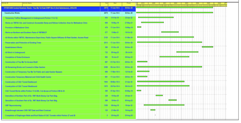 · Building Services (BS) Works and Architectural Builders Works and Finishes (ABWF) Works of Methadone Clinic (MC) · Diaphragm wall Construction at Zone E · Grouting Works at YMTPS · Prebored socket H-pile at YMTPS · Prebored socket H-pile at temporary Public Library cum Jade Hawker Bazaar Building (TPLBJHB) · Drainage Construction and Backfilling at MCHC · Base Slab Construction at MCHC · Diaphragm wall Construction at Zone A · Predrilling Works at Zone C