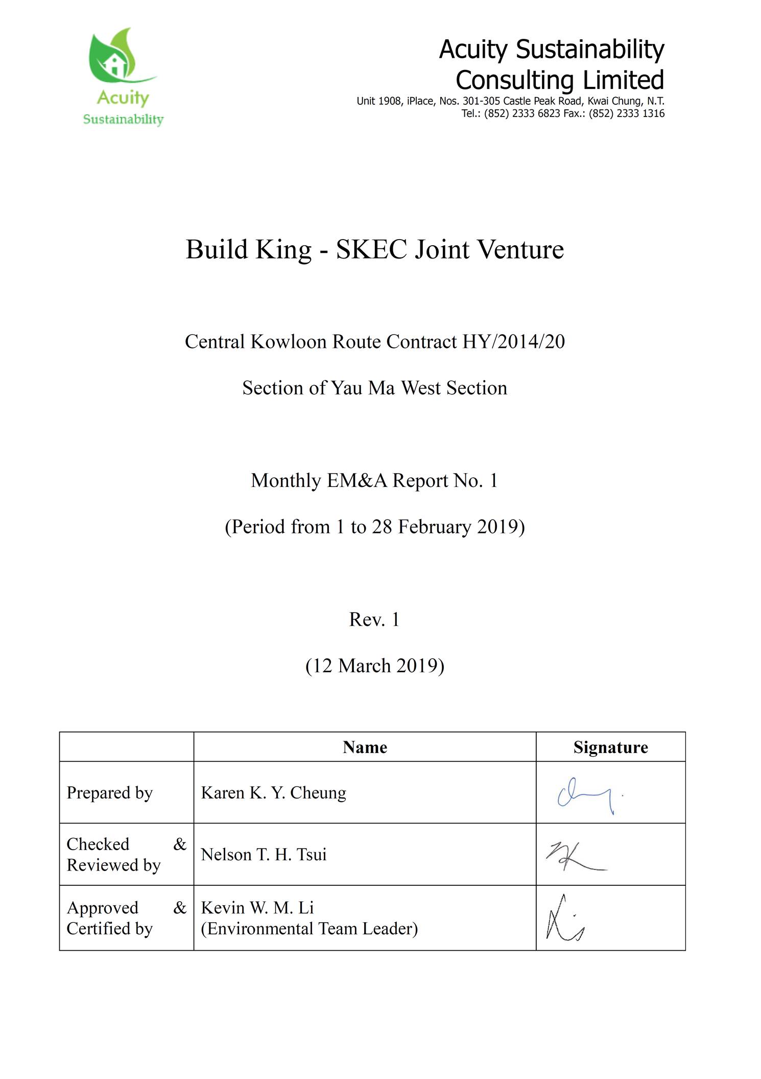 A.1 Build King – SKEC Joint Venture (“Contractor”) commenced the construction works of Highway Department (HyD) Central Kowloon Route Contract No. HY/2014/20 – Section of Yau Ma Tei West (“The Project”) on 12 February 2019. This is the 1st monthly Environmental Monitoring and Audit (EM&A) report presenting the EM&A works carried out during the period from 12 February 2019 to 28 February 2019.