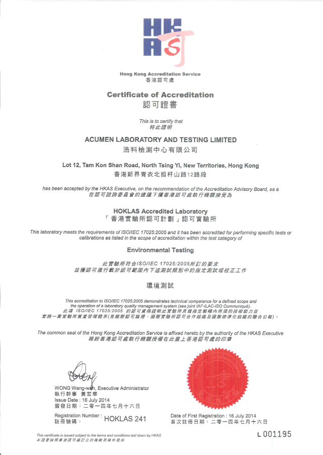 J. The Certification of Laboratory with HOKLAS Accredited Analytical Tests