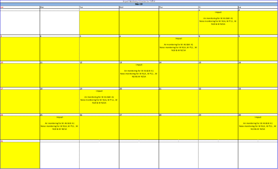 A.10 No exceedance of the Action and Limit Levels of 24-hour TSP and 1-hour TSP monitoring were recorded during the reporting period.