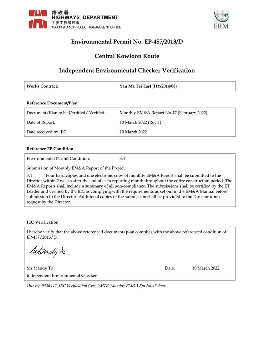 1.2. The Central Kowloon Route – Design and Construction Environmental Impact Assessment Report (Register No.: AEIAR-171/2013) was approved with conditions by the Environmental Protection Department (EPD) on 11 July 2013. An Environmental Permit (EP 457/2013) was issued on 9 August 2013. Variations of EP (VEP) was applied for and the EP (EP-457/2013/C) was issued by EPD on 16 January 2017. Variations of EP (VEP) was subsequently applied for and the latest EP (EP-457/2013/D) was issued by EPD on 15 June 2021. A Further EP (FEP-03/457/2013/D) was issued by EPD on 5 November 2021.