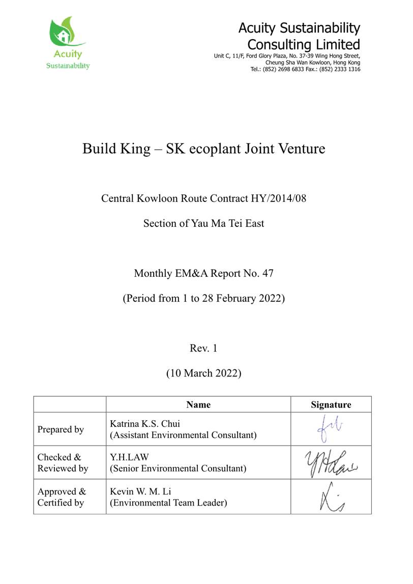 A.1 Build King – SK ecoplant Joint Venture (“Contractor”) commenced the construction works of Highway Department (HyD) Central Kowloon Route Contract No. HY/2014/08 – Section of Yau Ma Tei East (“The Project”) on 20 April 2018. This is the 47th monthly Environmental Monitoring and Audit (EM&A) report presenting the EM&A works carried out during the period from 1 February 2022 to 28 February 2022.