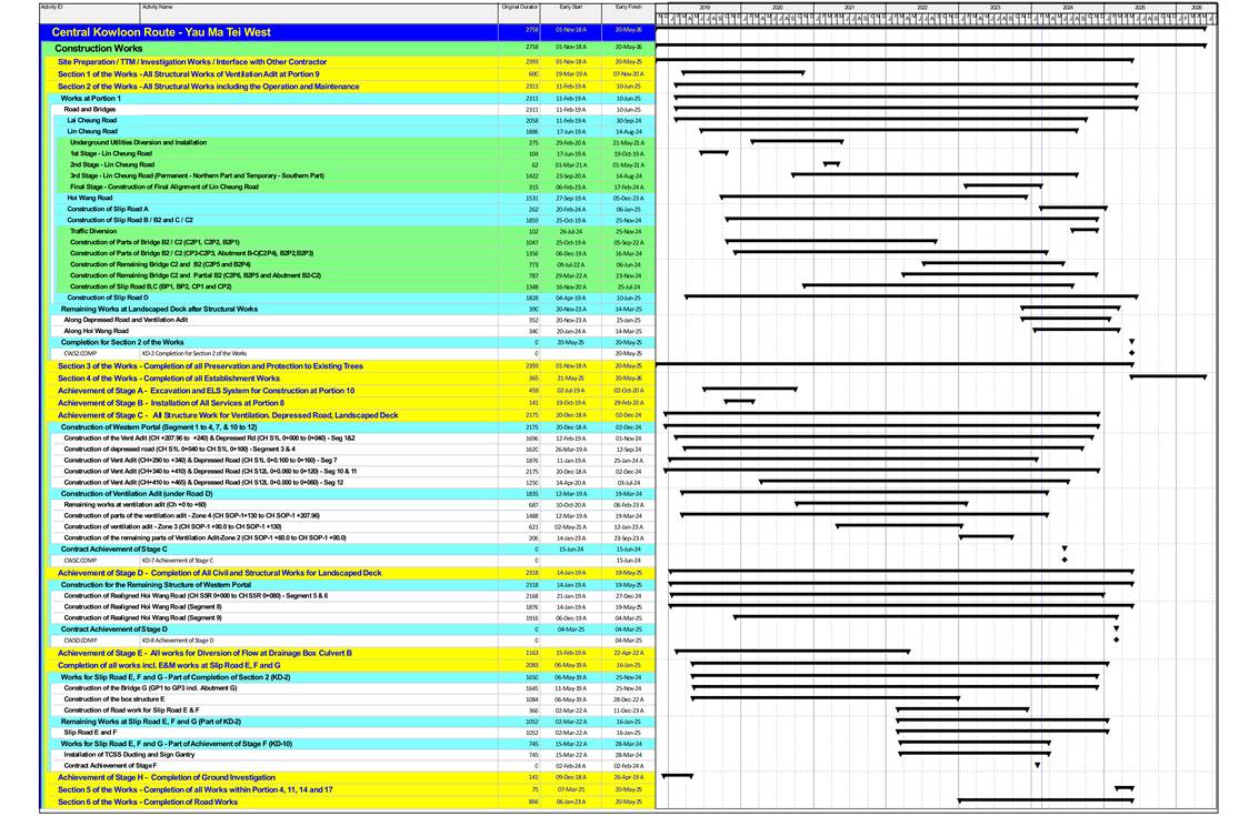 · Remaining Socket H-Pile at Segments 5 (to complete) at Portion 1B and 1D · Along Lin Cheung Road – remaining road works at Portion 1E · Noise Barrier C02 Road Works in progress at Portion 1E · Slip Road A footing construction for NB-C06 & V09 at Portion 1E · Parapet Wall at Bridge B, B2, C, C2, D, E & F at Portion 1B, 1G · Remaining FSW-3 Footing & Upstand Wall at Portion 1 · Road D Structure I Construction at Portion 1E · Reinforced Concrete Works & Backfilling at Vent. Adit Ch 175~240 at Zone 4C and A1 in Portion 1E · Remaining Foundation and Abutment Wall AW05 at Recovery Area in Portion 1B · Road Widening Works at Slip Road E & F in Portion 1A & 1B · Slip Road E & F Road Works and Sign Gantry Installation in Portion 1A & 1B · Backfilling at Subway and Staircase South Construction in Portion 1B · Remaining Upstand Wall and Column Construction at Segments 1 to 3 in Portion 1B & 1D · Fire Separation Wall FSW-4 and FSW-5 at Elevated Road at Segment 7 in Portion 1D · Sump Pit construction at Segment 10 in Portion 1F · Excavation, Lateral Support Works & Excavation at Escape Route Staircase No. 4 in Portion 1F · Roadworks at Segment 3, 4, 7, 10, 11 & 12A in Portion 1B & 1F · Landscaped Deck Construction at Segment 12b (OHVA & Landscaped Deck) in Portion 1F · Reinforced Concrete works for Escape Route Staircase No. 1 to 2 at Portion 1F and 10 · Remaining Piling Works at Segment 5 (West side) in Portion 1D · Portal Installation at Segment 5 in Portion 1D · Sheet Piling works prior to Pile Cap construction at Segments 8 & 9 and Washout Chamber in Portion 1D · Excavation and Base Slab Construction at HWR Plant Room Building in Portion 1D |