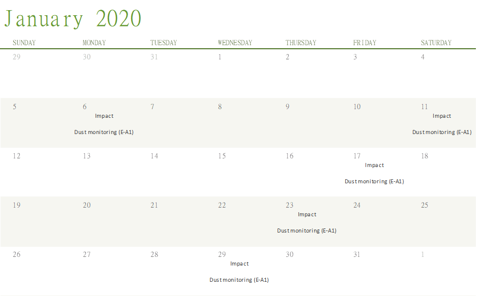 A.6 Bi-weekly inspection of the implementation of landscape and visual mitigation measures was conducted on 2, 15 January 2020. Details of the audit findings and implementation status are presented in Section 5.