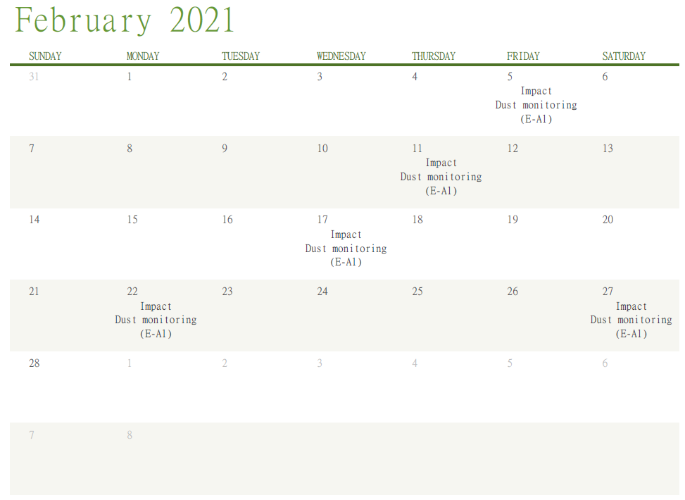 8.1 This is the 4th Monthly EM&A Report which presents the EM&A works undertaken in Kai Tak East Area during the reporting month from 1st January 2021 – 31st January 2021 in accordance with the EM&A Manual and the requirements under the EP.