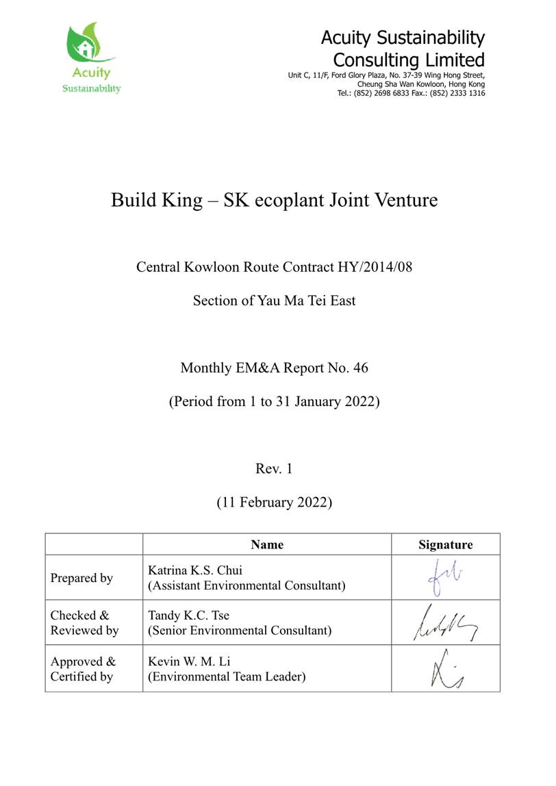 A.1          Build King – SK ecoplant Joint Venture (“Contractor”) commenced the construction works of Highway Department (HyD) Central Kowloon Route Contract No. HY/2014/08 – Section of Yau Ma Tei East (“The Project”) on 20 April 2018. This is the 46th monthly Environmental Monitoring and Audit (EM&A) report presenting the EM&A works carried out during the period from 1 January 2022 to 31 January 2022.