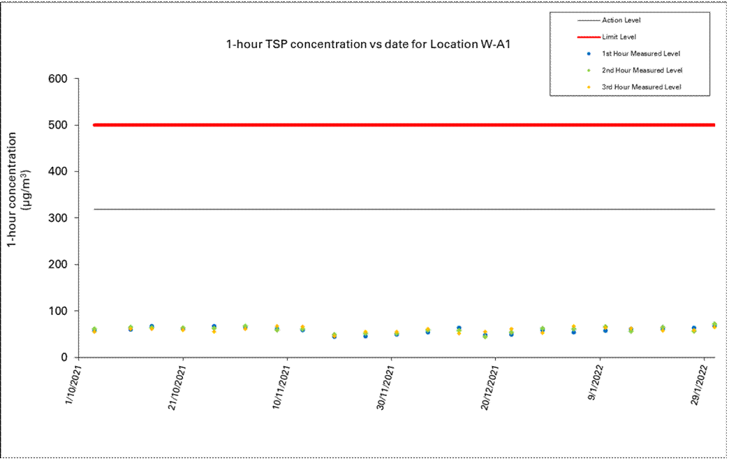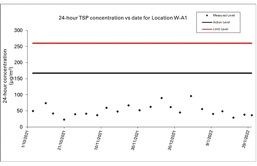 A.8      Two Action Levels of construction noise were triggered during the reporting period as two documented complaints were received on 20 and 26 January 2022 related to construction noise from works areas at Gascoigne Road Flyover and Portion 21. No exceedance of Limit Level of construction noise was recorded in the reporting month. No exceedance of the Action and Limit Levels of 24-hour TSP and 1-hour TSP was recorded during the reporting month.