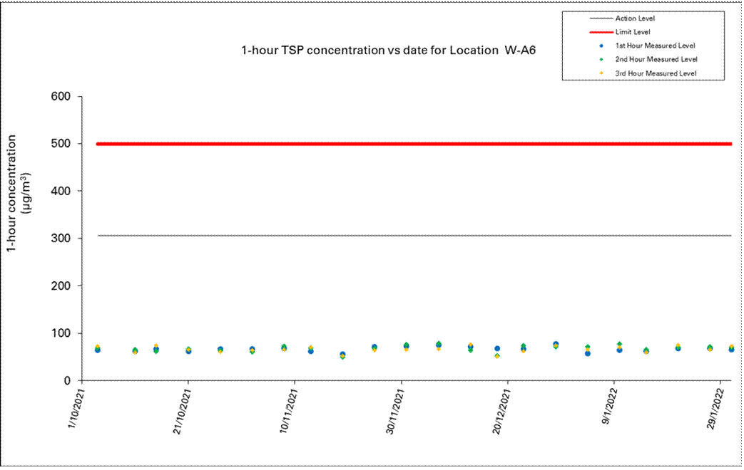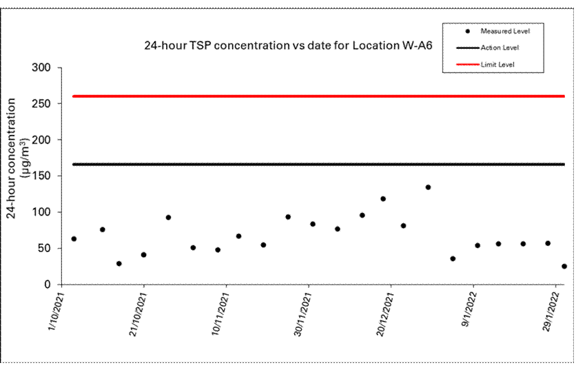 A.7          Due to the electricity supply failure for the high volume sampler (HVS) on 10 January 2022 at Man Cheong Building (W-A6), 24-hour TSP result was voided. Inspection and repair works for the electricity supply were conducted by the Contractor on 11 January 2022. Additional monitoring for 24-hour TSP at W-A6 was arranged on 12 January 2022. The result was valid and used as a substitute for the voided monitoring result on 10 January 2022.