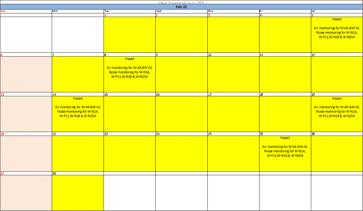 A.3          A summary of regular construction noise and construction dust monitoring activities in this reporting period is listed below: