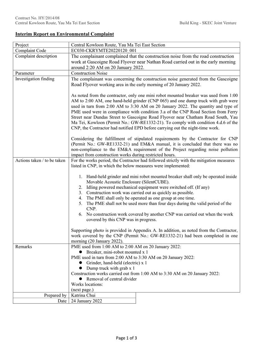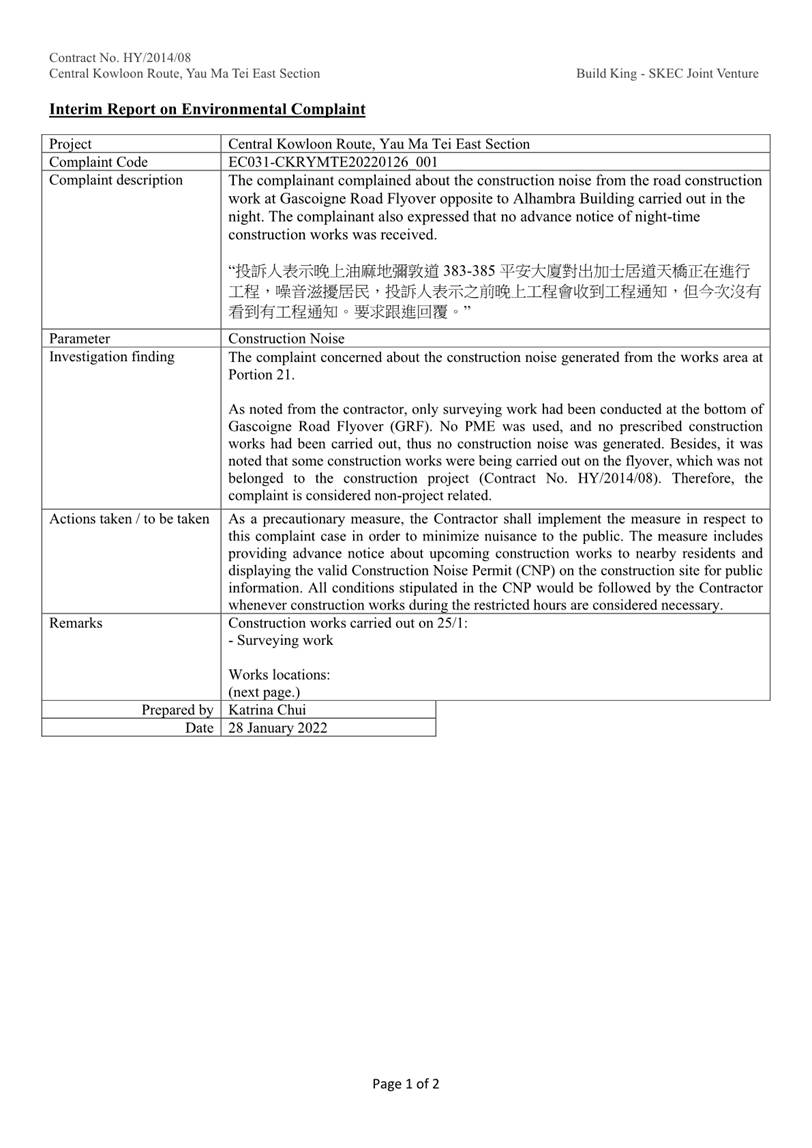 A.9          One noise-related complaint and one non-project related complaint were received on 20 and 26 January 2022. After investigation with Contractor, precautionary measures had been proposed to the Contractor by ET. The interim reports for the complaints are shown in Appendix Q.