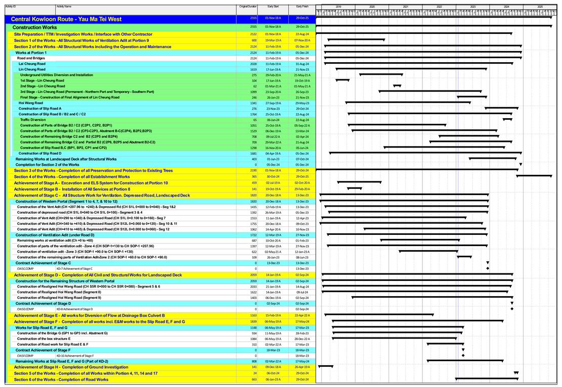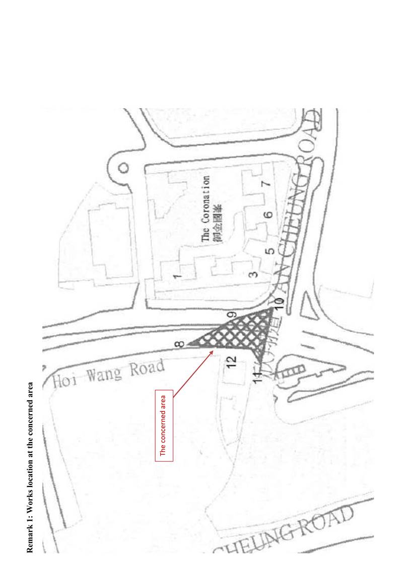· Pre-drilling Works at Portion 1B and 1D · Socket H-Pile (Landscaped Deck and Bridges) at Portion 1B and 1D · Noise Barrier C02, C03 & S01 (along Lin Cheung Road) at Portion 1E · Bridge Deck Construction at Bridge C Deck 2 and Bridge B Deck 1 including portal installation in Portion 1E and 1B · 3rd Lin Cheung Road Traffic Diversion at Portion 1E · Abutment B-C construction at Portion 1B · Vent. Adit Ch 175~240 at Zone 4B, 4C and A1 in Portion 1E · Parapet Wall Construction at Bridge G in Portion 1B · Abutment Wall Construction at Slip Road E in Portion 1B · Excavation and Lateral Support Works and Excavation Works (Segment 4, 7, 10 to 12) for Vent. Adit and Depressed Road Construction including Escape Route Staircase No. 1 to 3 at Portion 1F and 10 · Vent Adit Ch 280~290 at Segment 4 in Portion 1D · Vent Adit Ch 300~360 at Segments 7 & 10 including Road Slab in Portion 1F · Vent Adit Ch 360~410 at Segment 11 including Road Slab in Portion 1F · Landscaped Construction at Segment 7 in Portion 1D · Pile Cap, Wall and Column Construction along Hoi Wang Road (Segments 5, 6, 7, 8 and 9) at Portion 1D · Landscaped Deck Construction at Segments 6 and 8a in Portion 1D · Hoi Wang Road Diversion Phase 2a at Portion 1D |