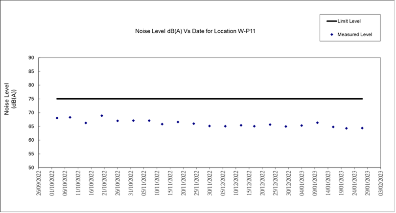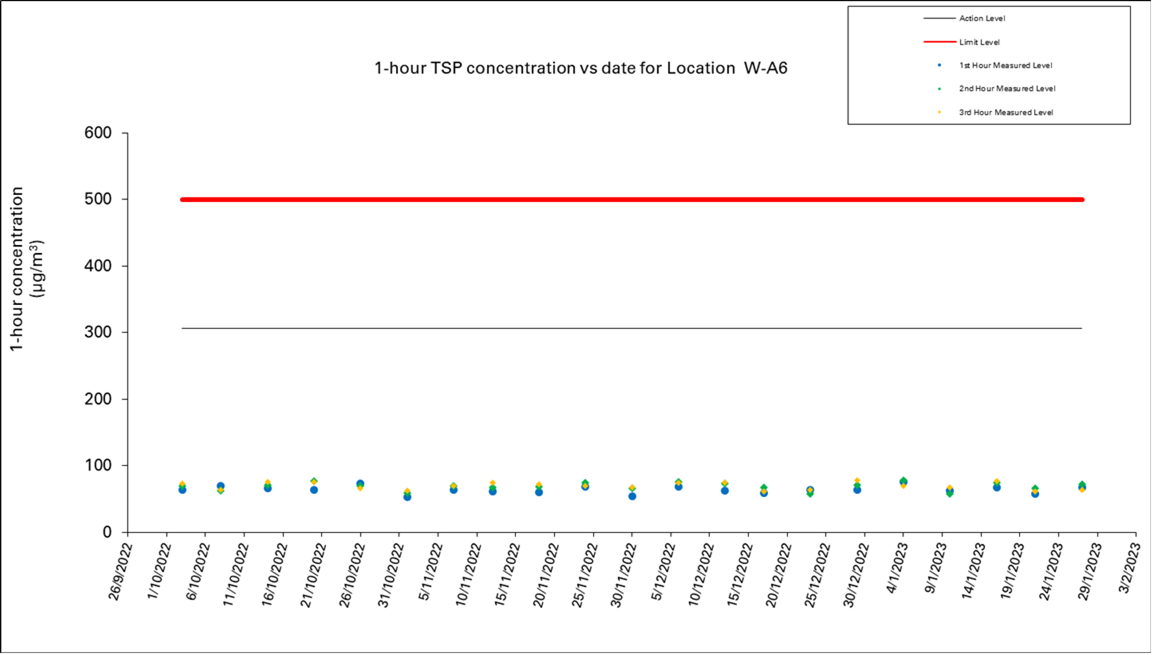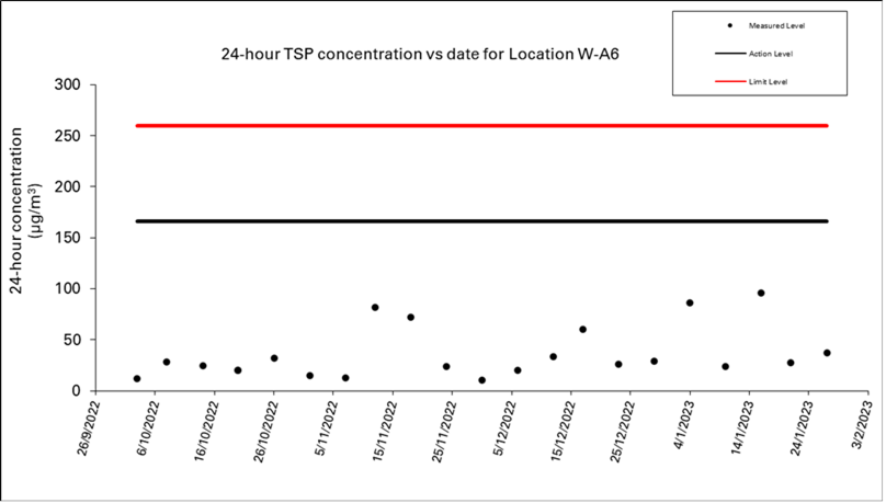 A.7 One Action Level of construction noise was triggered during the reporting period as documented complaint was received on 31 January 2023 related to construction noise from works areas at the section of Hoi Wang Road near backdoor of New Yau Ma Tei Police Station. No exceedance of Limit Level of construction noise was recorded in the reporting month. No exceedance of the Action and Limit Level of 24-hour TSP and 1-hour TSP was recorded in the reporting month.