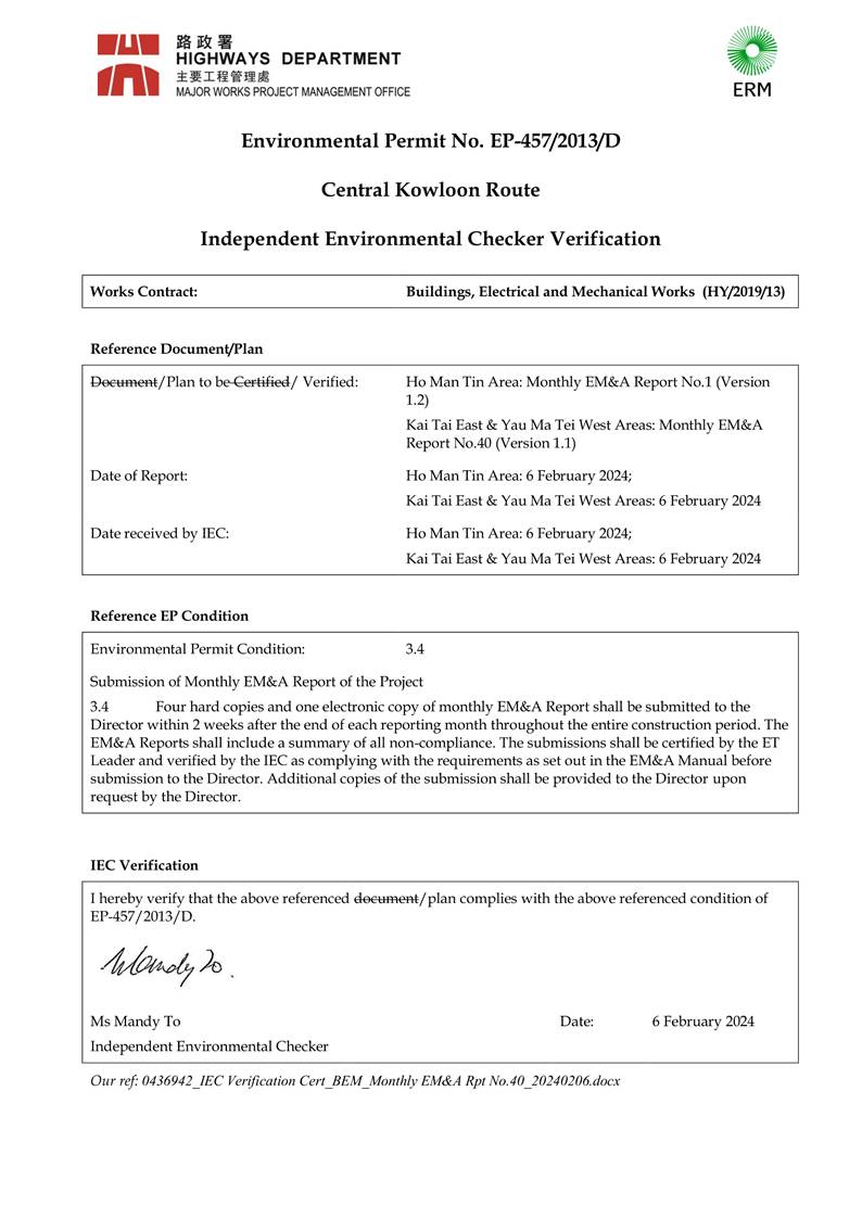 8.1.1 The 53rd Monthly EM&A Report for the Contract No. HY/2018/08 Central Kowloon Route – Central Tunnel summarized the monitoring results and audits findings of the EM&A programme under the issued EP (EP No.: EP-457/2013/D) and in accordance with the EM&A Manual during the reporting period from 01/01/2024 to 31/01/2024.