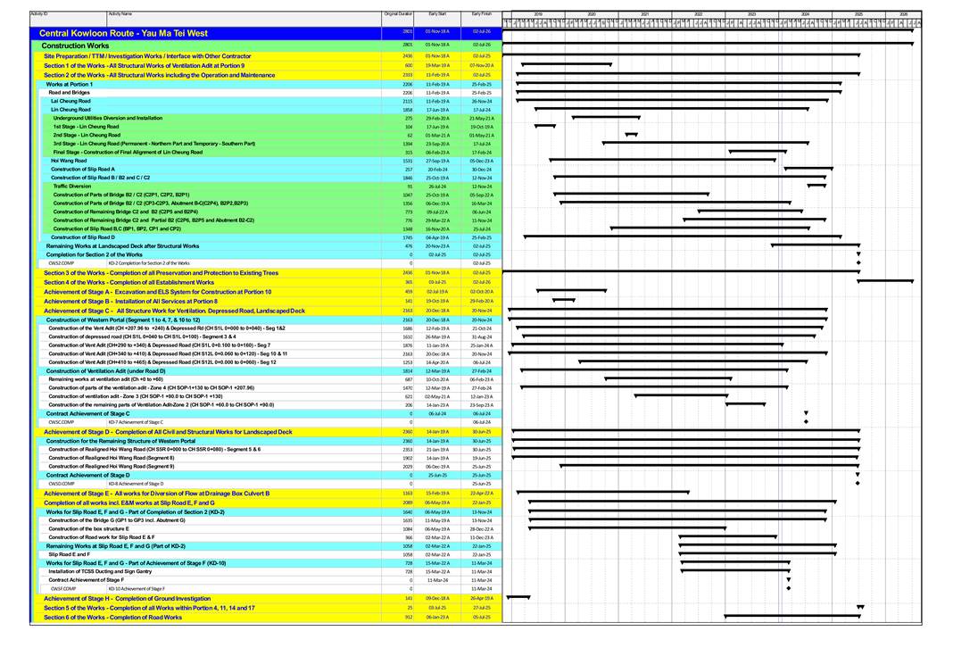 · Remaining Socket H-Pile at Segments 5 (to complete) at Portion 1B and 1D · Noise Barrier S01 Bay 3 installation of Steel Structure, panel and Roadworks (along Lin Cheung Road) – Including Lin Cheung Road Traffic Diversion (4th phase) at Portion 1E · Noise Barrier C02 Road Works in progress at Portion 1E · Parapet Wall at Bridge B, B2, C, C2 and D at Portion 1B, 1G · Road D Structure I Construction at Portion 1E · Reinforced Concrete Works at Vent. Adit Ch 175~240 at Zone 4C and A1 in Portion 1E · Parapet Wall and Noise Barrier Installation along Slip Road E & F in Portion 1A and 1B · Slip Road E & F Construction (Sign Gantry Installation) in Portion 1A · Reinforced Concrete Works for Escape Route Staircase No. 1 to 2 in Portion 1F and 10 · Subway and Staircase Construction in Portion 1B · Remaining Pile Cap, Upstand Wall and Column Construction at Segment 1 to 3 in Portion 1B & 1D · Landscaped Deck Construction at Segment 3 & 4 (to start Roadworks) at segment 1B · Landscaped Deck Construction at Segment 10 & 11 (OHVA Late Cast & Roadworks) at segment 1F · Sump Pit construction at Segment 10 in Portion 1F · Landscaped Deck Construction at Segment 12a (Roadworks) in Portion 1F · Landscaped Deck Construction at Segment 12b (OHVA & Landscaped Deck) in Portion 1F · Remaining Piling Works at Segment 5 (West side) in Portion 1D · Segment 8 & 9 Pile Cap, Upstand Wall & Column (West Side) including Hoi Wang Road Plant Room in Portion 1D |