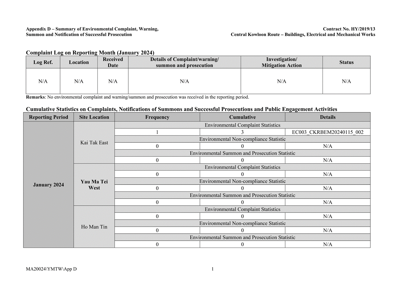 Appendix D Summaries of Environmental Complaint, Warning, Summon and Notification of Successful Prosecution
