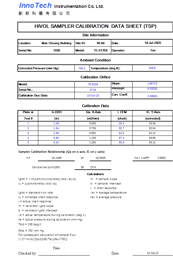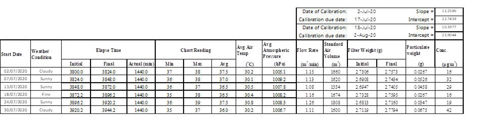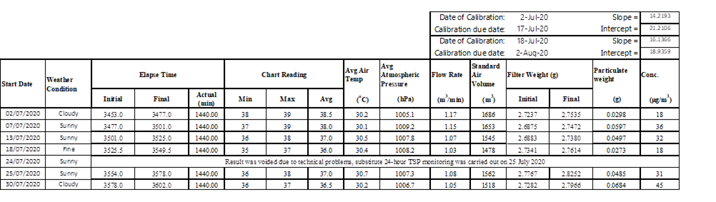A.4 Due to the technical problem for HVS equipment on 24 July 2020 at Man Cheong Building (W-A6), 24-hour TSP dust monitoring was suspended. Equipment inspection was conducted and the problem was fixed on 25 July 2020. Supplementary 24-hour TSP dust monitoring was conducted on the same day.