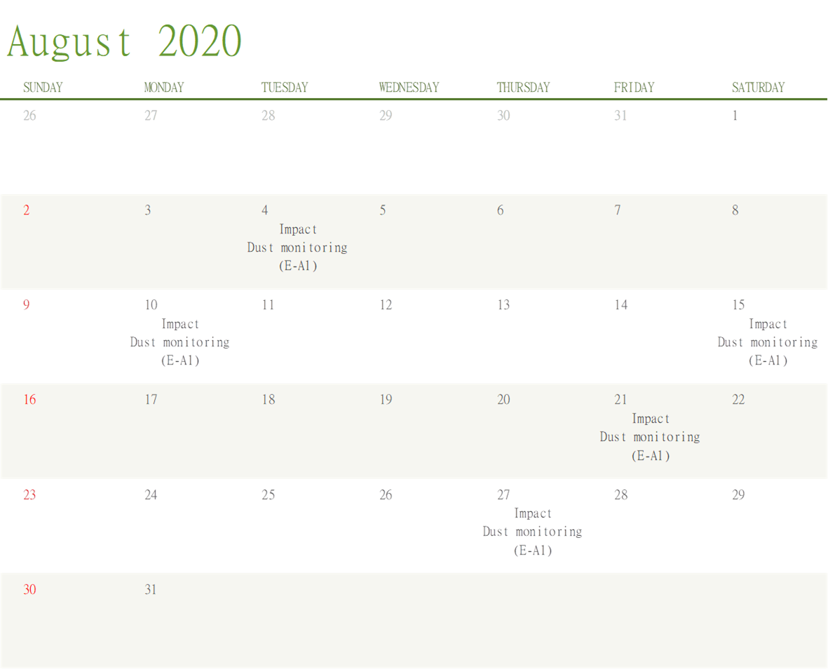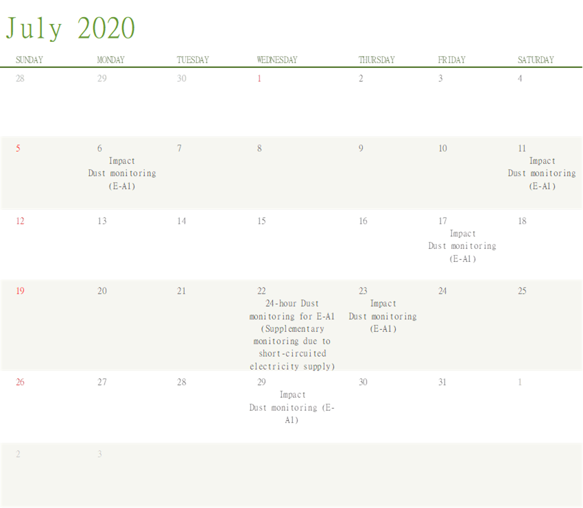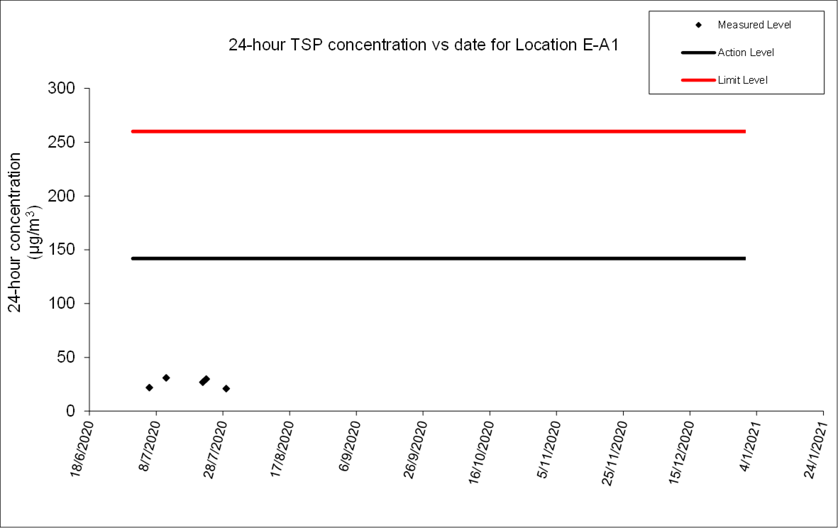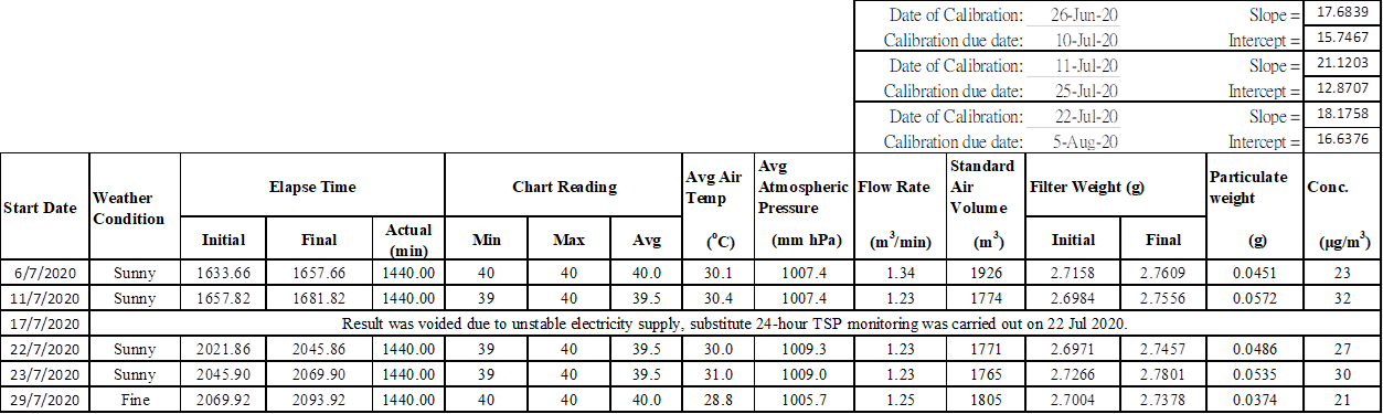 A.4 Due to the short-cirucited electricity supply for HVS equipment on 17 Jul 2020 at Hong Kong International Trade and Exhibition Centre (E-A1), 24-hour TSP dust monitoring was suspended. Immediate equipment inspection was performed and the problem was not fixed on 21 Jul 2020. A back-up HVS equipment was replaced on 22 Jul 2020 for the malfunctioned HVS equipment at E-A1. Supplementary 24-hour TSP dust monitoring was conducted on 22 Jul 2020.