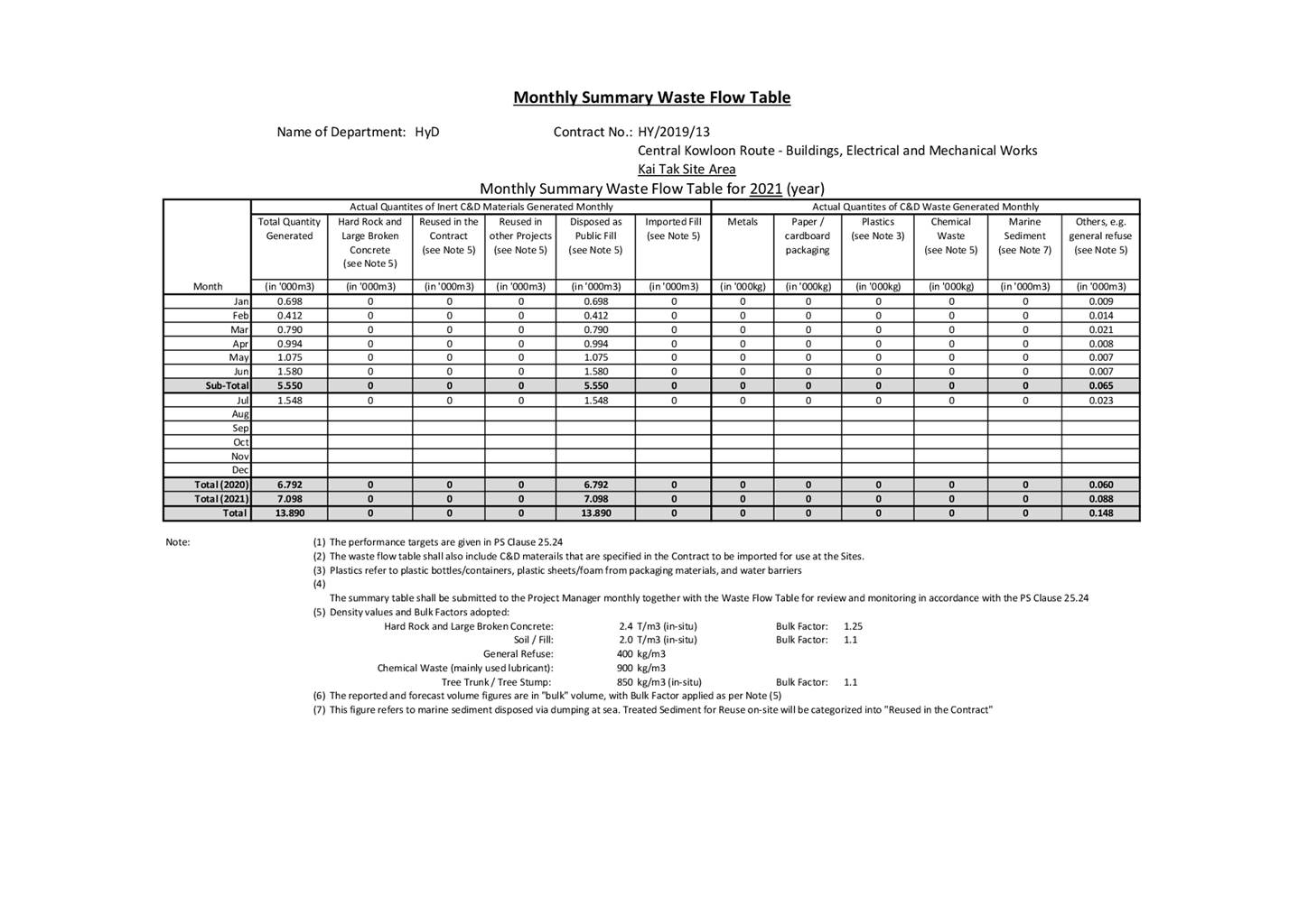 A.1 Alchmex – Paul Y Joint Venture (“Contractor”) commenced the construction works of Highway Department (HyD) Central Kowloon Route Contract No. HY/2018/02 – Section of Kai Tak East (“The Project”) on 9 September 2019. This is the 23rd monthly Environmental Monitoring and Audit (EM&A) report presenting the EM&A works carried out during the period from 1 July 2021 to 31 July 2021.