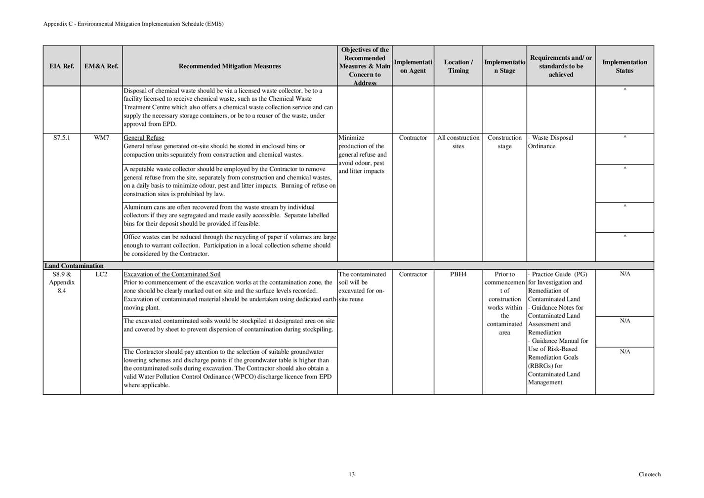 F.3 According to Environmental Permit, the approved EIA Report (Register No.: AEIAR-171/2013), and the EM&A Manual of the Project, the mitigation measures detailed in the documents are recommended to be implemented during the construction phase. An Environmental Mitigation Implementation Schedule (EMIS) is provided in Appendix C.