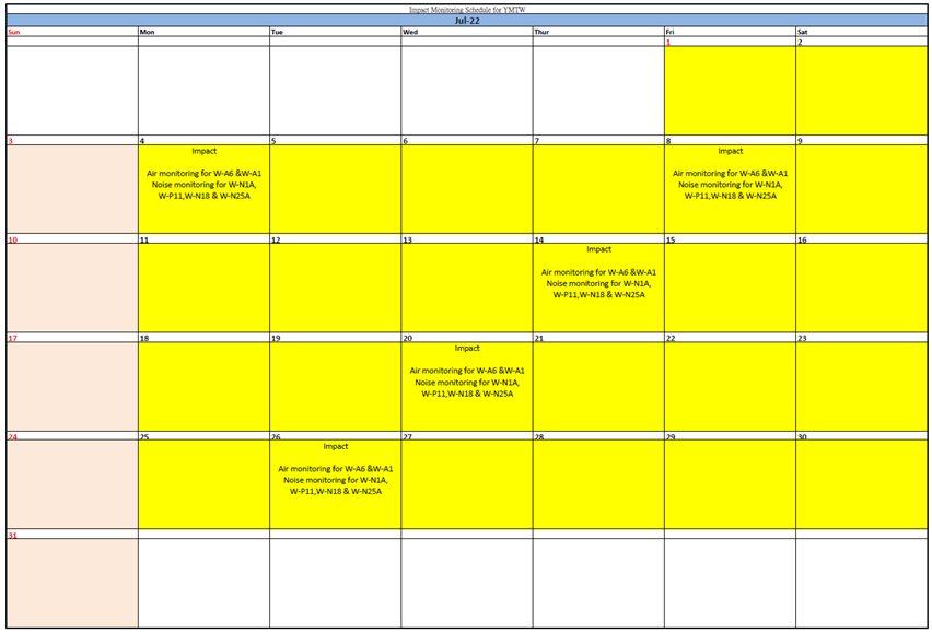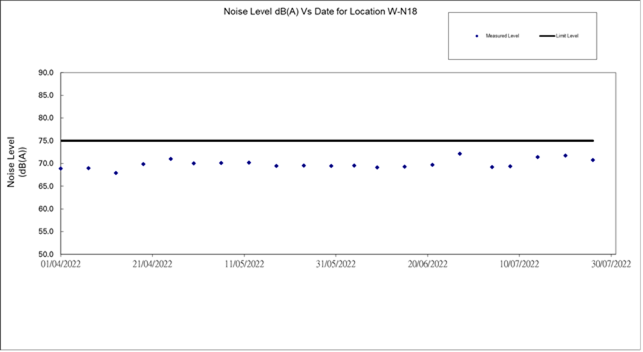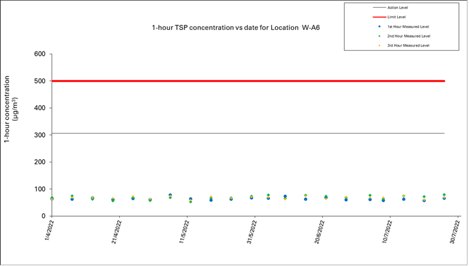 A.7 Two Action Levels of construction noise were triggered during the reporting period as documented complaints were received on 13 and 15 July 2022 related to construction noise from works areas at Portion 1D and 1F. No exceedance of the Limit Level of construction noise was recorded in the reporting month. No exceedance of the Action and Limit Levels of 24-hour TSP and 1-hour TSP was recorded during the reporting month.