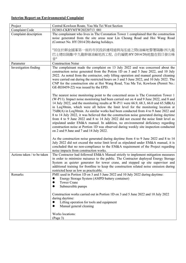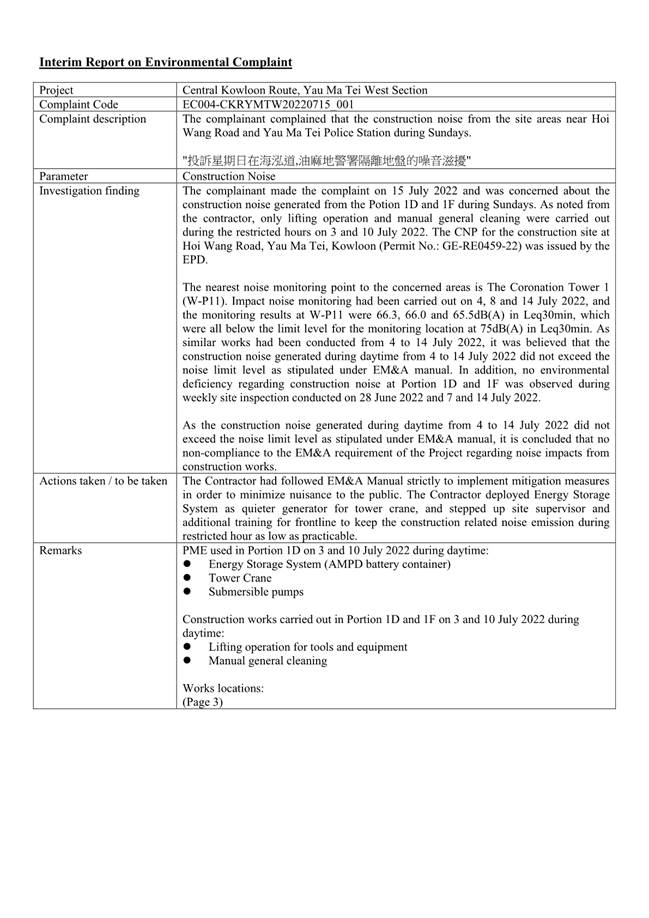 A.8 Two noise related complaints were received on 13 and 15 July 2022. After investigation with Contractor, precautionary measures had been proposed to the Contractor by ET. The interim reports for the complaints are shown in Appendix Q.