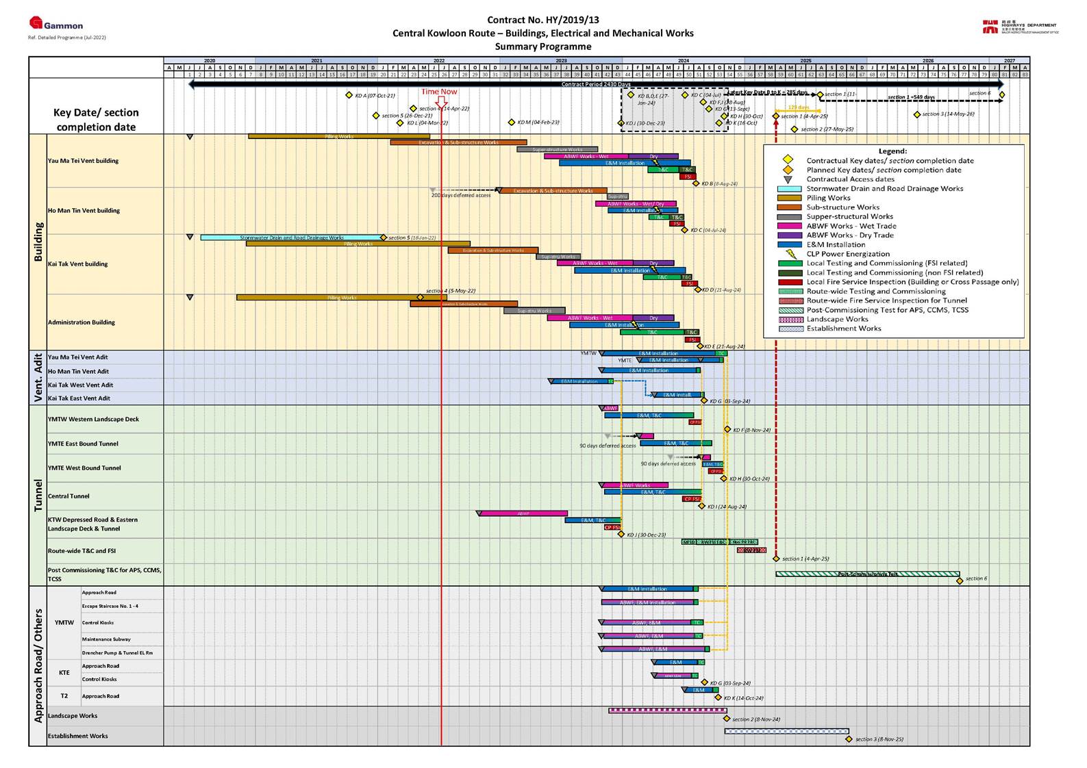 · Pre-drilling Works at Portion 1B and 1D · Socket H-pile at Portion 1B and 1D · Construction of Vent. Adit Ch 90~130 (Zone 3) · Construction of Noise Barrier C02, C03 & S01 (along Lin Cheung Road) at Portion 1E · Bridge Deck Construction at Bridge C2 Deck 2 and Bridge B2 Deck 1 at Portion 1E · Pier Construction CP3, C2P3, B2P2 and BP2 at Portion 1E · Bridge Deck Construction at Bridge C Deck 2 and Bridge B Deck 1 at Portion 1E · Pile Cap DPC1 and Abutment B for Bridge D at Portion 1E · Vent. Adit Ch 175~240 at Zone 4B, 4C and A1 at Portion 1E · Parapet Wall Construction at Bridge G at Portion 1B · Abutment Wall Construction at Slip Road E at portion 1B · Excavation and Lateral Support Works (Segment 4, 7, 10 to 12) for Vent. Adit and Depressed Road Construction including Escape Route Staircase No.1 to 3 at Portion 1F and 10 · Vent Adit Ch 300~360 at Segement 7 & 10 at Portion 1F · Vent Adit Ch 360~410 at Segement 11 at Portion 1F · Elevated Hoi Wang Road at Portion 1D · Pile Cap and Column Construction along Hoi Wang Road (Segment 5, 6, 7, 8 and 9) at Portion 1D · Construction of Temporary Hoi Wang Road – Phase 1a at Potion 1B, 1D and 1G |